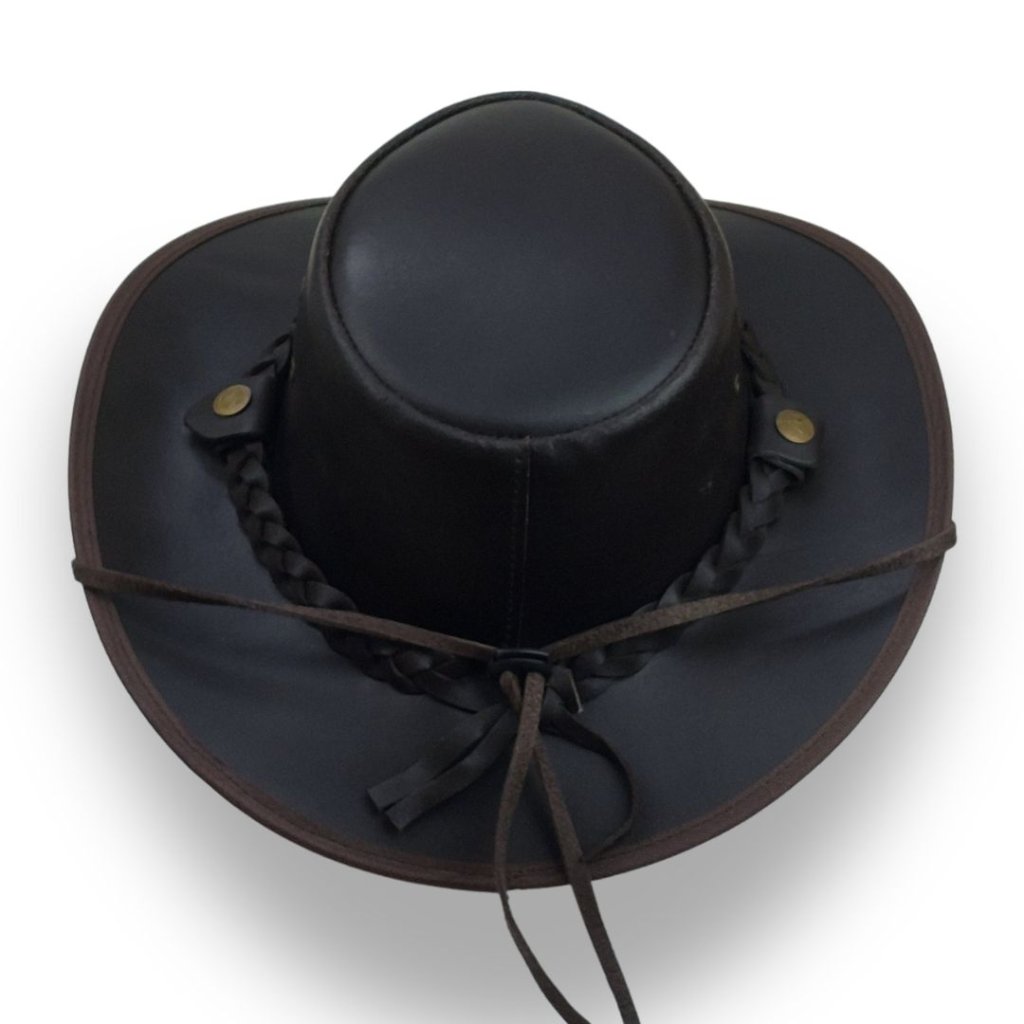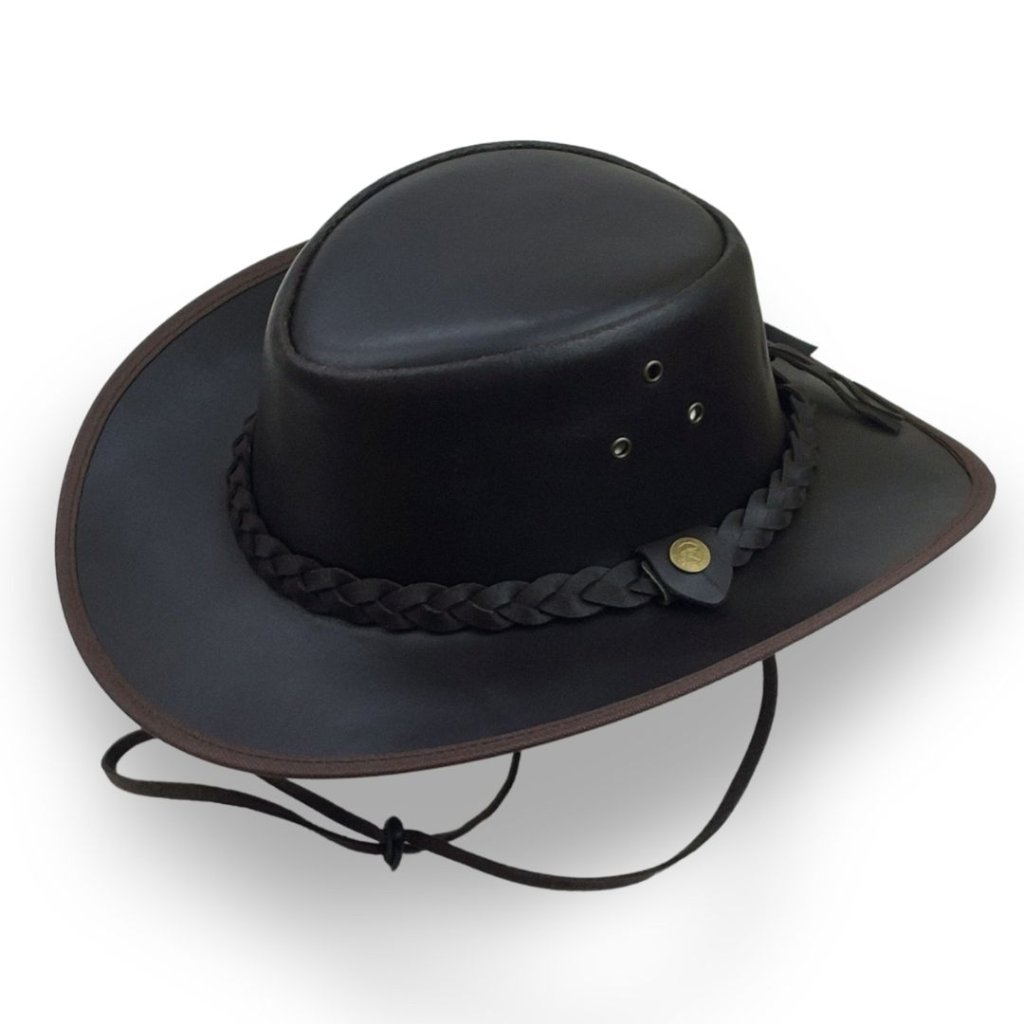 Stylový australský, tmavě hnědý klobouk z kůže je ideální volbou pro všechny, kdo hledají spojení praktičnosti a nadčasového vzhledu. Tmavě hnědá barva se hodí ke všemu a decentní pletený pásek okolo koruny dodává klobouku elegantní detail. Nastavitelný řemínek pod bradou zajišťuje, že klobouk zůstane na svém místě i ve větrném počasí, perfektní na výlety do přírody, festivaly, cestování nebo každodenní nošení. Je odolný vůči počasí, pohodlný na celodenní nošení a skvěle doplní jak outdoorový, tak městský outfit.