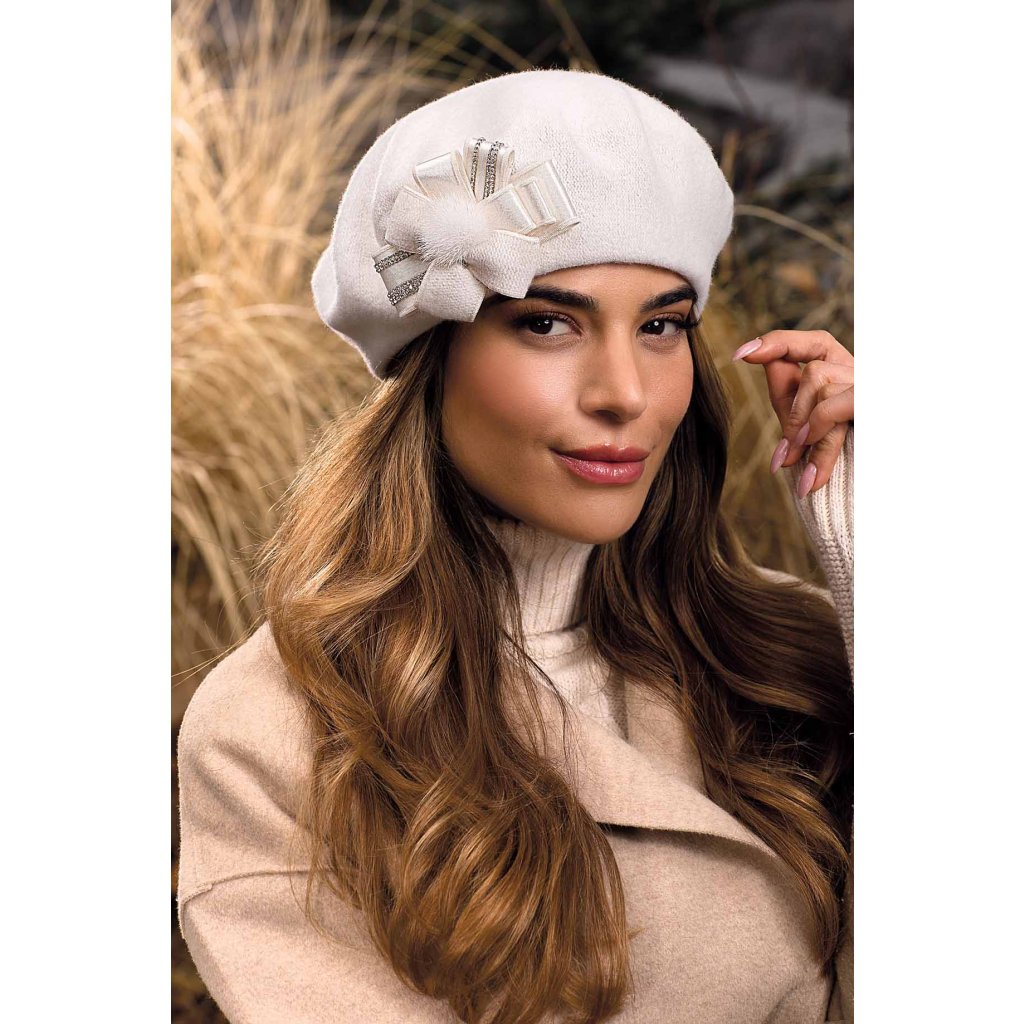 Bílý zimní dámský baret zdobený mašlí a srstěnou bambulkou W-0805