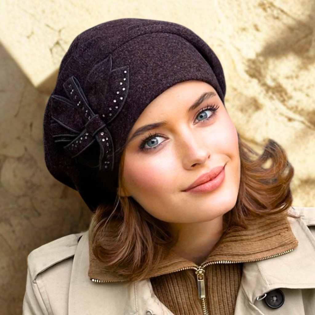 Dámská čepice je úžasně řemeslně zpracovaná na dotek z velmi příjemného a jemného materiálu. Má skvělý baretový střih, flísovou podšívkou a je ručně ozdobená mašličkou s kamínky tón v tónu. Tuto celoroční čepici doladíte i k ležérnímu stylu oblečení. Velikost vhodná na obvod hlavy 56 cm - 59 cm. Čepici nabízíme v několika barevných provedení. Ilustrační fotografie na modelce je stejná čepice v hnědé barvě, kterou máme také v nabídce.