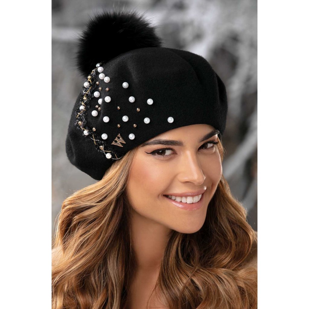 Černý baret s bambulí z nejkvalitnější vlny s certifikátem Woolmark, která se dokonale přizpůsobí každé velikosti hlavy. Elegantní černá zimní čepice má originální charakter, který jí dodávají ručně našité bílé perly a zlaté perličky s ozdobnou stužkou. Celek čepice je doplněn přírodní kožešinovou bambulí obarvenou do tónu barvy vlny. Tato krásná vlněná čepice má měkkou a hřejivou podšívku.