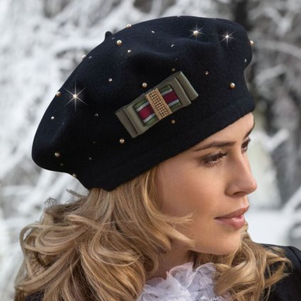 Mimořádně stylový černý baret z hřejivé a měkké certifikované 100% vlny Woolmark, která se dokonale přizpůsobí každé velikosti hlavy. Jedinečný charakter dodává působivá luxusní aplikace zirkonů ve tvaru hvězd a třpytivých krystalů.