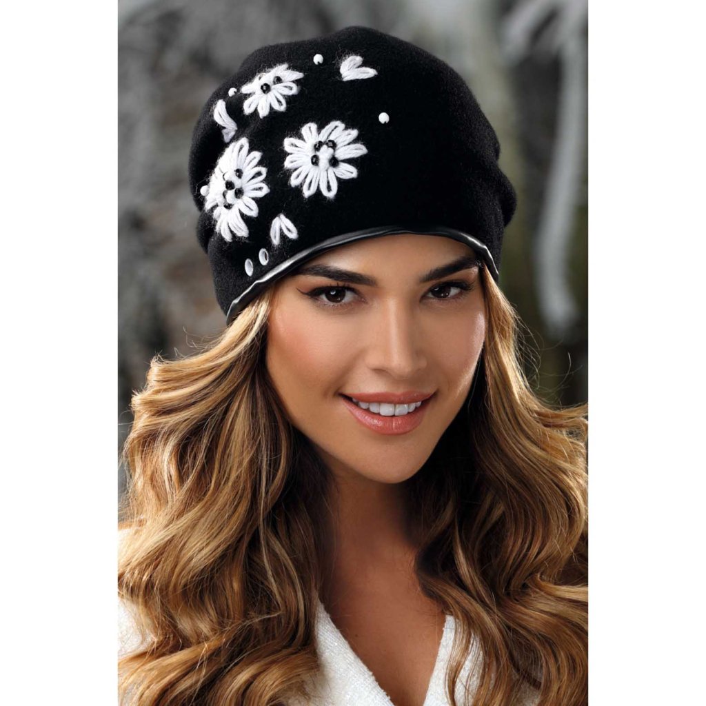 Černá čepice z hřejivé a měkké certifikované vlny Woolmark, která se dokonale přizpůsobí každé velikosti hlavy. Jedinečný charakter dodává dámské čepici skvělý střih a originální aplikace tvořená ručně vyšívanými květinami z měkké, bílé příze a broušenými kamínky. Dámská čepice má teplou a měkkou podšívku a nastavitelné šňůrky v lemu pro snadnou úpravu velikosti.