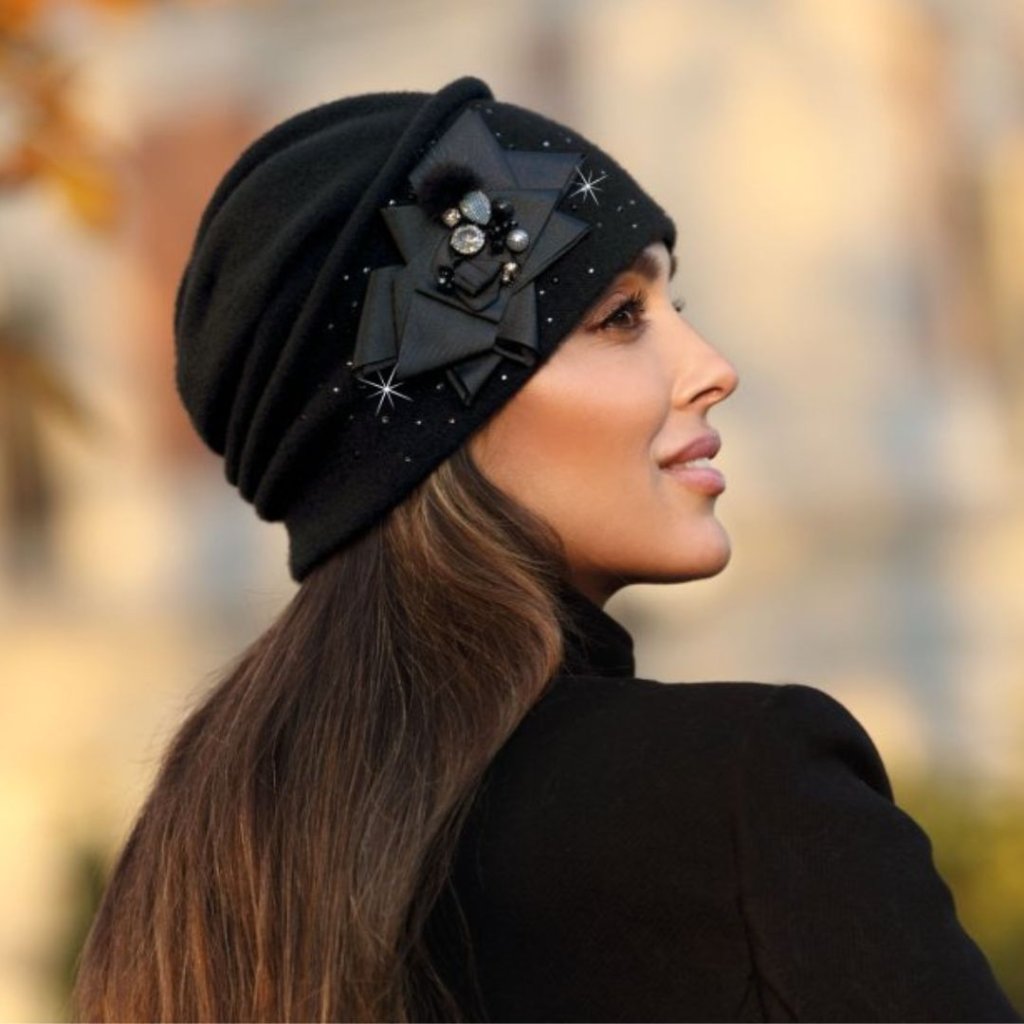 Černá zimní čepice z certifikované vlny české výroby, ručně zdobená úžasnou aplikací a perličkami. Vlna je velmi měkká, díky čemuž se výrobek dokonale přizpůsobí velikosti hlavy. Černá čepice má úžasný střih a je mimořádně slušivá a pohodlná.