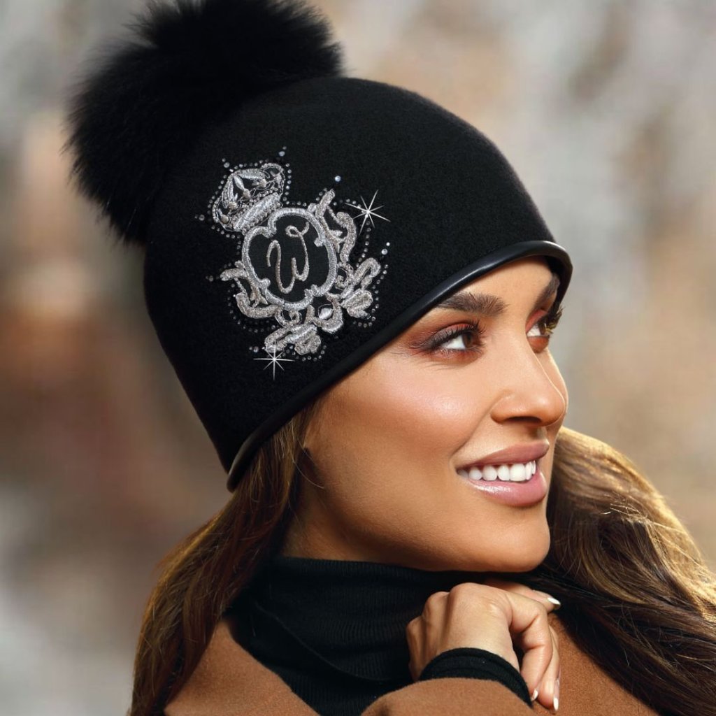 Módní zimní černá čepice s bambulí z hřejivé a měkké certifikované vlny Woolmark, která se dokonale přizpůsobí každé velikosti hlavy. Módní charakter dámské čepici dodává aplikace tvořená z originální výšivky a třpytivých broušených kamenů. Dámský kulich doplňuje přírodní kožešinová bambulka. Dámská čepice s bambulí má teplou a měkkou podšívku a nastavitelné šňůrky v lemu pro snadnou úpravu velikosti.