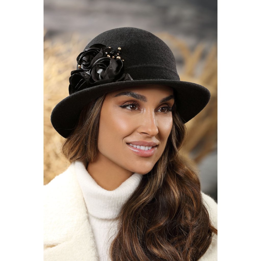 Černý dámský vlněný klobouk s černými květy W-0606/018