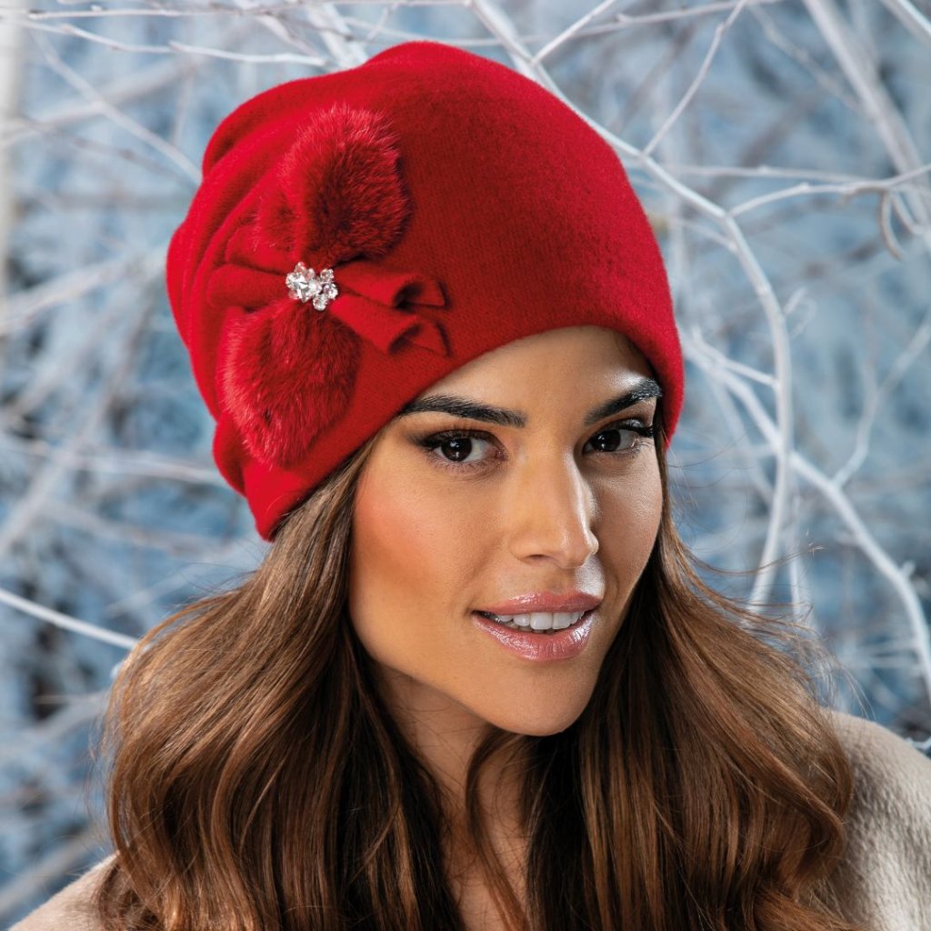 Tato elegantní dámská zimní červená čepice je ideálním doplňkem pro chladné měsíce. Její rafinovaný design sází na nadčasovou červenou barvu a výrazné, přesto jemné zdobení, čepice je doplněna dekorací z jemné kožešinky a blyštivých kamínků ve středu, které dodávají lesk i ženský půvab.