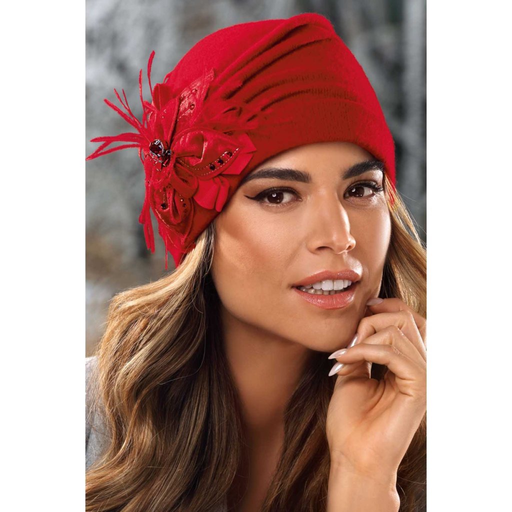 Červená zimní dámská čepice zdobená květem a chmýřím W-0694/001