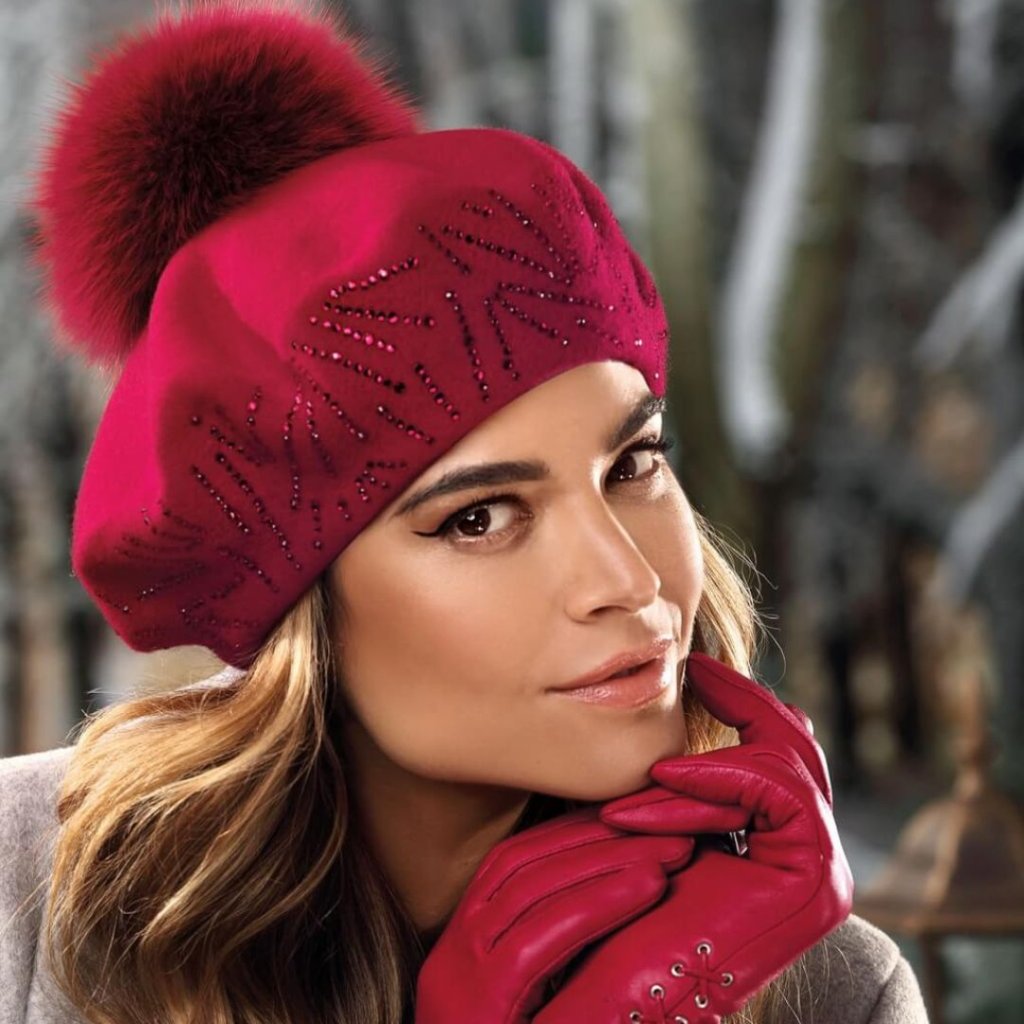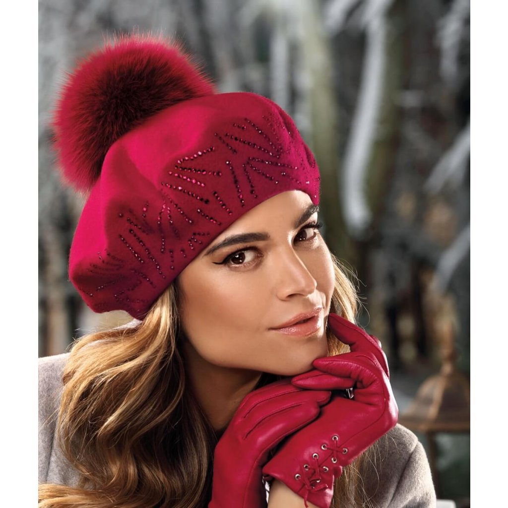 Dámský baret vyrobený z nejkvalitnější vlny s certifikátem Woolmark. Červený baret je ručně zdobený jemně třpytivými krystaly v elegantním vzoru. Celek je doplněn přírodní kožešinovou bambulí barvenou do barvy vlny. Tato jedinečná dámská čepice hlavy má měkkou a hřejivou podšívku.