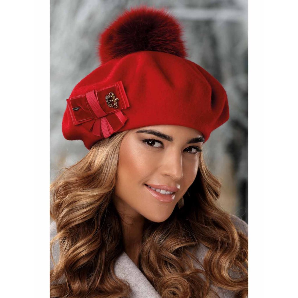Červený dámský baret s bambulí a zdobením W-0707/001