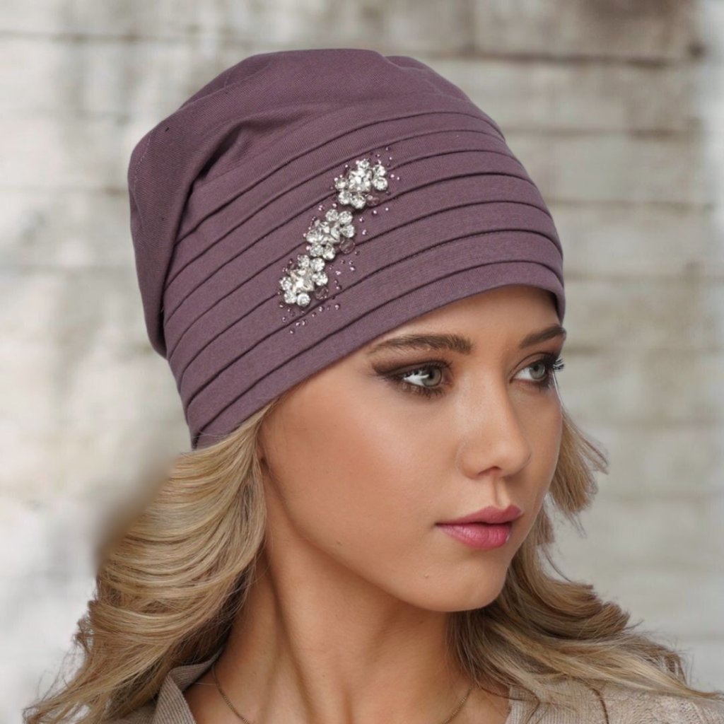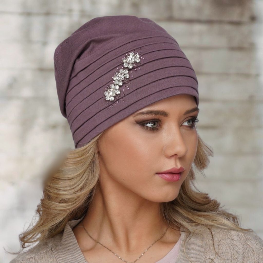 Dámská starorůžová čepice je precizně řemeslně zpracovaná na dotek z velmi příjemného a jemného materiálu je ozdobena luxusní ozdobou z bílých zirkonů, kterou lemují kamínky sladěné s barvou čepice tón v tónu. Pohodlná dámská čepice má propracovaný lem, který je sofistikovaně skládaný a zaručuje vždy perfektní vzhled, který hlavu neobepíná, ale vytváří tvar, který dokonale rámuje obličej. Čepice je ušitá ze dvou vrstev bavlněné tkaniny má moderním a velmi slušivý spadlý střih s mírně prodlouženým koncem. Tuto celoroční čepici doladíte i k ležérnímu stylu oblečení. Čepici nabízíme v několika barevných provedení a také v materiálu z viskózy (umělé hedvábí).