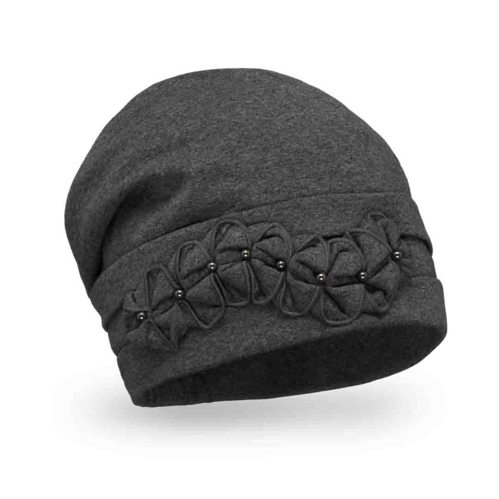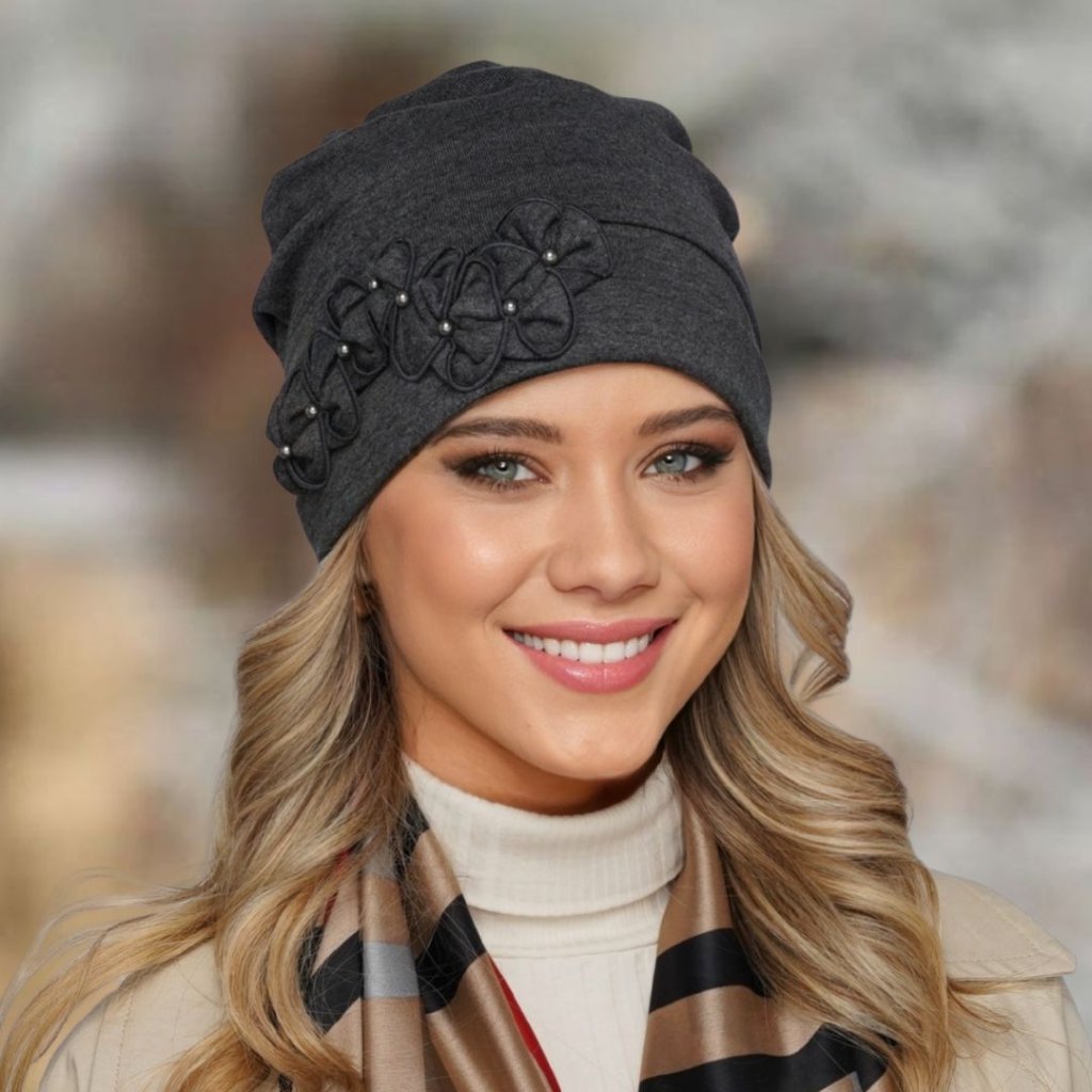 Dámská tmavě šedá čepice je precizně řemeslně zpracovaná na dotek z velmi příjemného a jemného materiálu je ozdobena bavlněnou aplikací s korálky sladěné s barvou čepice tón v tónu. Pohodlná čepice má propracovaný lem, který je sofistikovaně skládaný a zaručuje vždy perfektní vzhled, který hlavu neobepíná, ale vytváří tvar, který dokonale rámuje obličej. Čepice je ušitá ze dvou vrstev bavlněné tkaniny má moderním a velmi slušivý střih. Tuto celoroční čepici doladíte i k ležérnímu stylu oblečení. Čepici nabízíme v několika barevných provedení a také v materiálu z viskózy (umělé hedvábí).