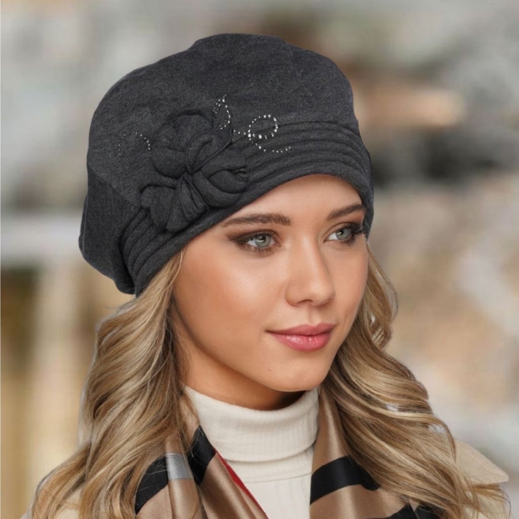 Dámská tmavě šedá čepice je precizně řemeslně zpracovaná na dotek z velmi příjemného a jemného materiálu je ozdobena bavlněným květem a kamínky sladěné s barvou čepice tón v tónu. Pohodlná dámská čepice má baretový střih, díky kterému neutrpí váš účes a zaručuje vždy perfektní vzhled, který hlavu neobepíná. Čepice je ušitá ze dvou vrstev bavlněné tkaniny má moderním a velmi slušivý baretový střih s prošívaným lemem. Tuto celoroční čepici doladíte i k ležérnímu stylu oblečení. Čepici nabízíme v několika barevných provedení a také v materiálu z viskózy (umělé hedvábí).