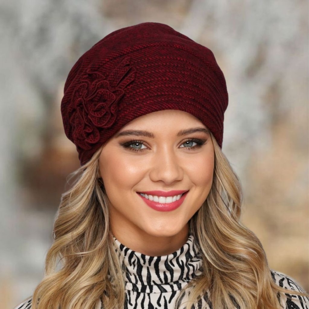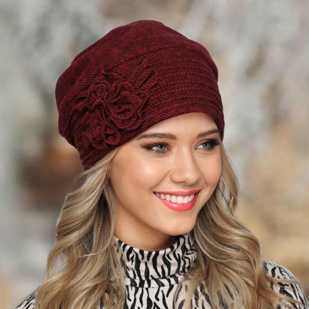 Dámská červená čepice je precizně řemeslně zpracovaná na dotek z velmi příjemného a jemného materiálu je ozdobena ručně vytvořenými květy sejné barvy. Pohodlná dámská čepice má propracovaný lem, který je sofistikovaně prošitý do sámků a zaručuje vždy perfektní vzhled, který hlavu neobepíná, ale vytváří tvar, který dokonale rámuje obličej. Čepice je ušitá ze dvou vrstev tkaniny a má velmi slušivý spadlý střih s mírně prodlouženým koncem. Tuto celoroční čepici doladíte i k ležérnímu stylu oblečení. Čepici nabízíme v několika barevných provedení.