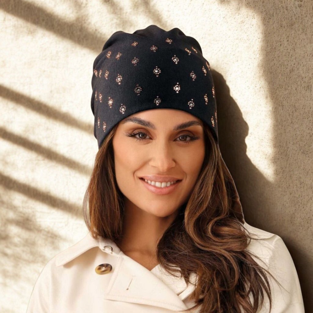 Bavlněná černá čepice zdobená kamínky tón v tónu je ušitá z kvalitní bavlny s vysokou hustotou tkaní. Čepice je ušitá ze dvou vrstev tkaniny a má moderní spadlý střih. Bavlna je velice příjemná na dotek, nesvírá hlavu. Tuto čepici oceníte v jarním a podzimním období.