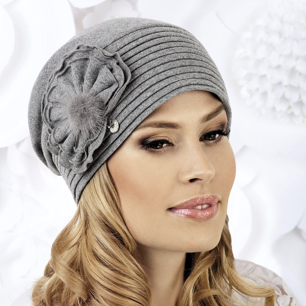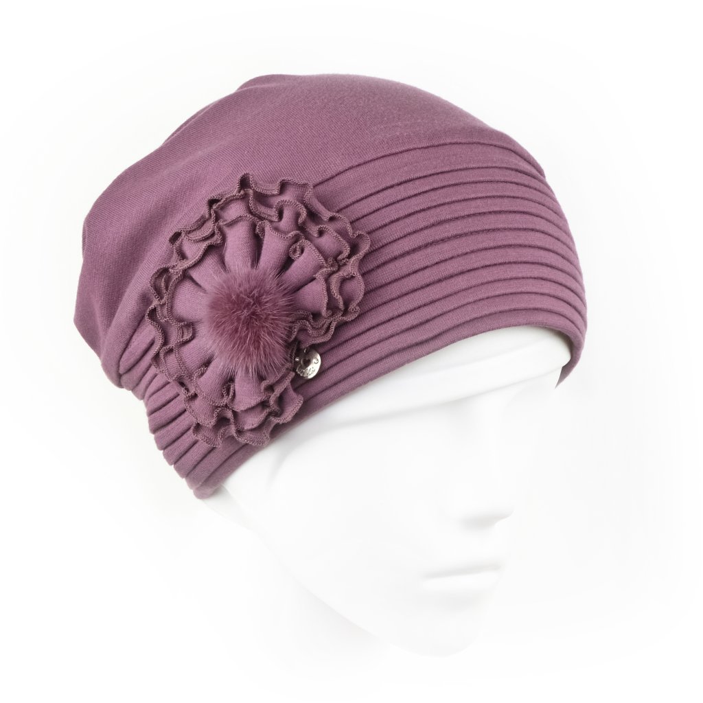 Dámská bavlněná čepice s květem a bambulkou na boku