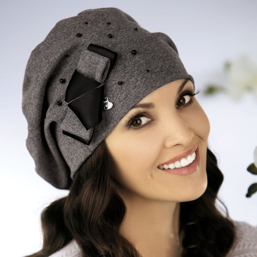 Krásná čepice baretového střihu v šedé barvě je ze dvou vrstev tkaniny ozdobená skládanou mašlí a perličkami tón v tónu. Čepice je ušitá z velmi pružné kvalitní bavlněné látky a díky baretovému střihu neutrpí váš účes.