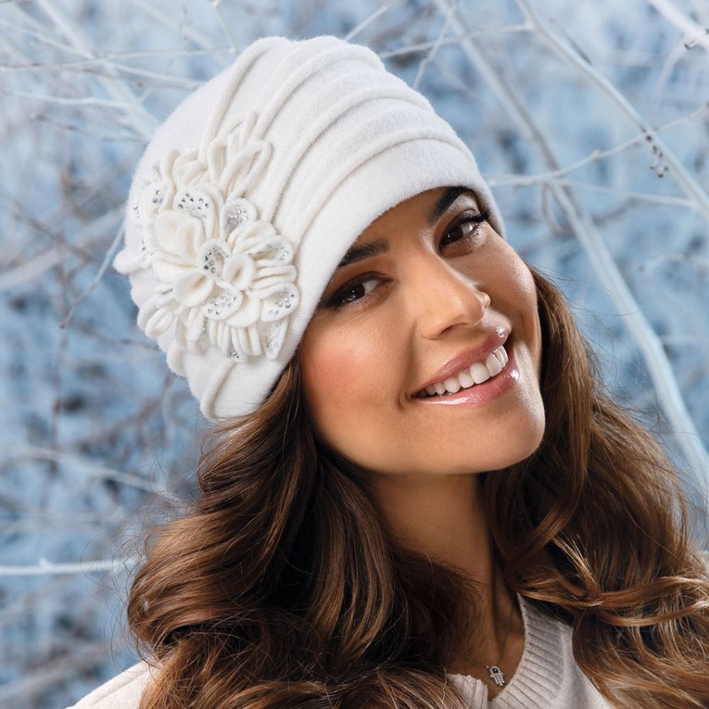 Dámská zimní čepice Krumlovanka v bílé barvě je symbolem elegance, ženskosti a zimního šarmu. Vyrobena z prvotřídní 100% vlny Woolmark, která zaručuje výbornou hřejivost, prodyšnost a pohodlí i během mrazivých dnů. Výrazným prvkem čepice je bohatá ručně zpracovaná květinová aplikace, doplněná jemnými lesklými kamínky, které dodávají modelu nádech luxusu a originality.