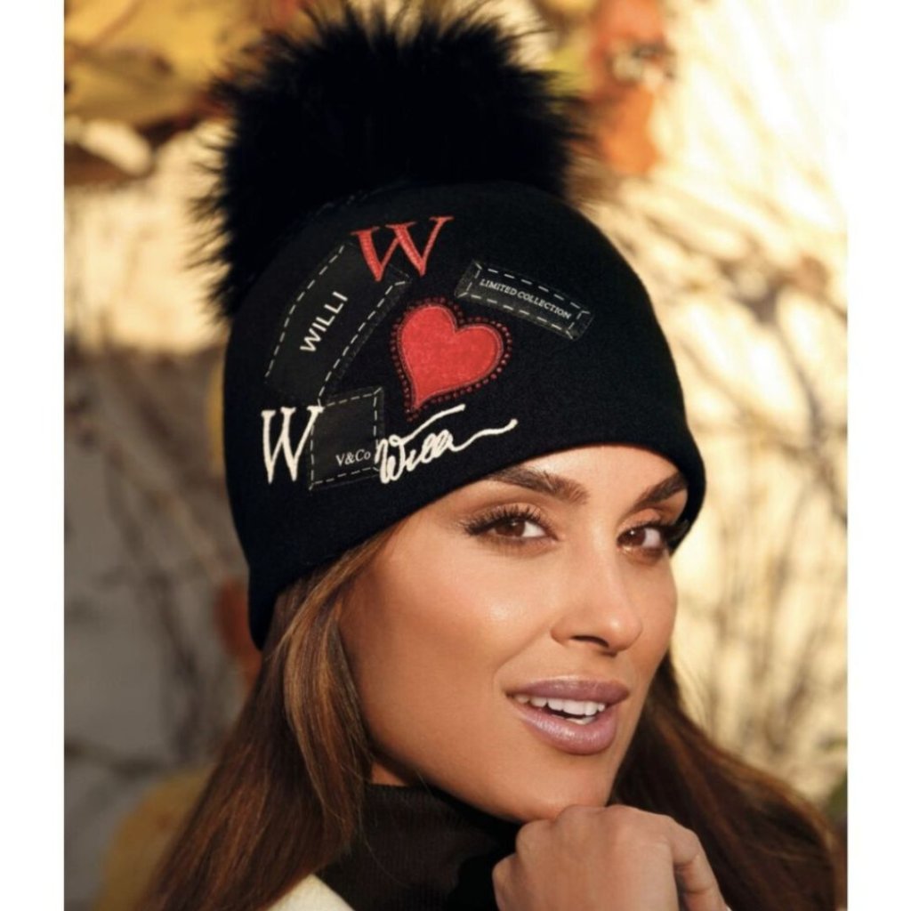 Zimní černá čepice vyrobená z certifikované vlny WoolMark. Čepice s bambulí je ozdobená ručně originální nášivkou, která dodává čepici módní styl. Doplňkovou ozdobou je našité srdce obklopené červenými krystaly a velká přírodní kožešinová bambulka. Díky měkké vlně se čepice přizpůsobí každé velikosti hlavy. Výrobek má teplou a měkkou flísovou podšívku.