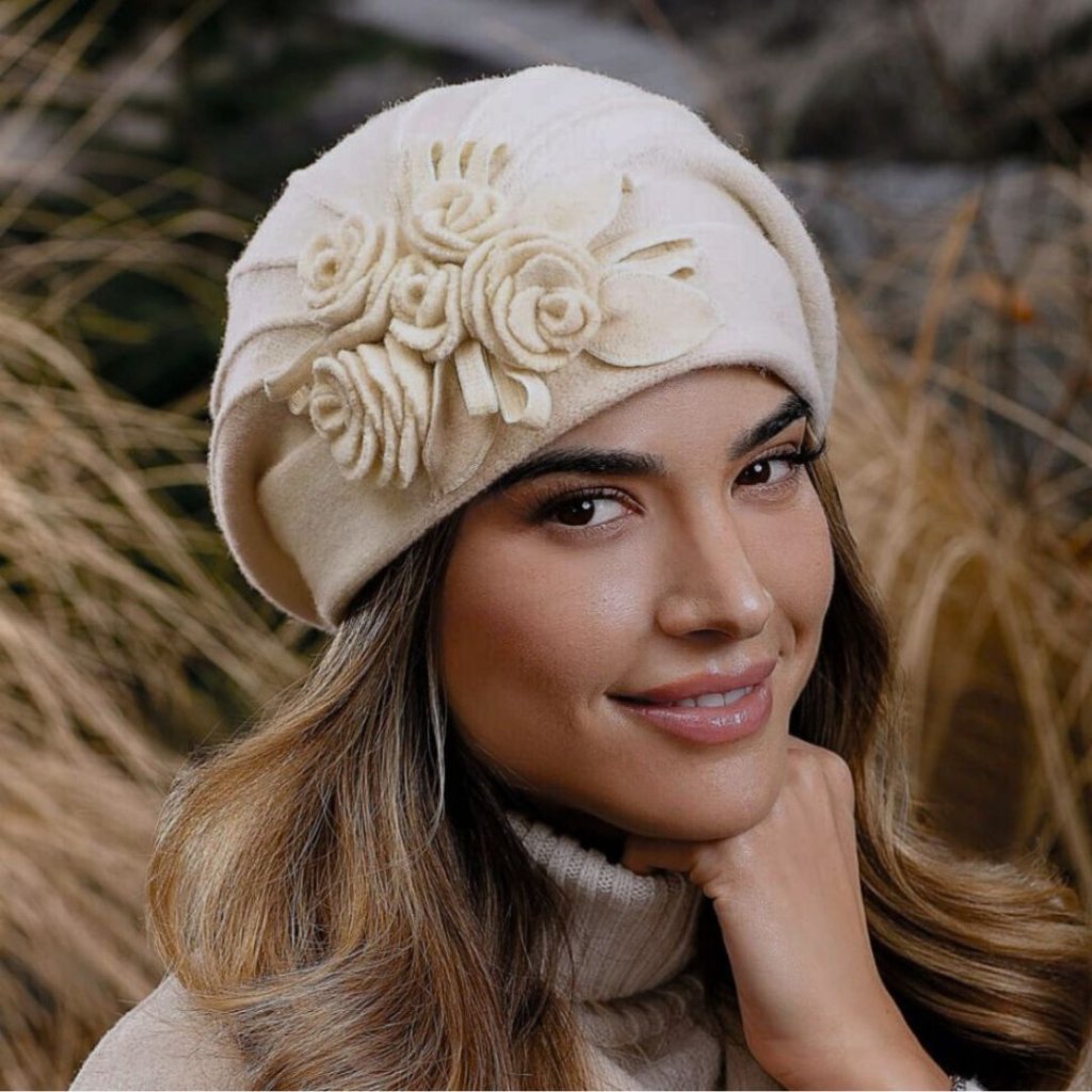 Dámská čepice baretového střihu s květem W-0842/452 krémová
