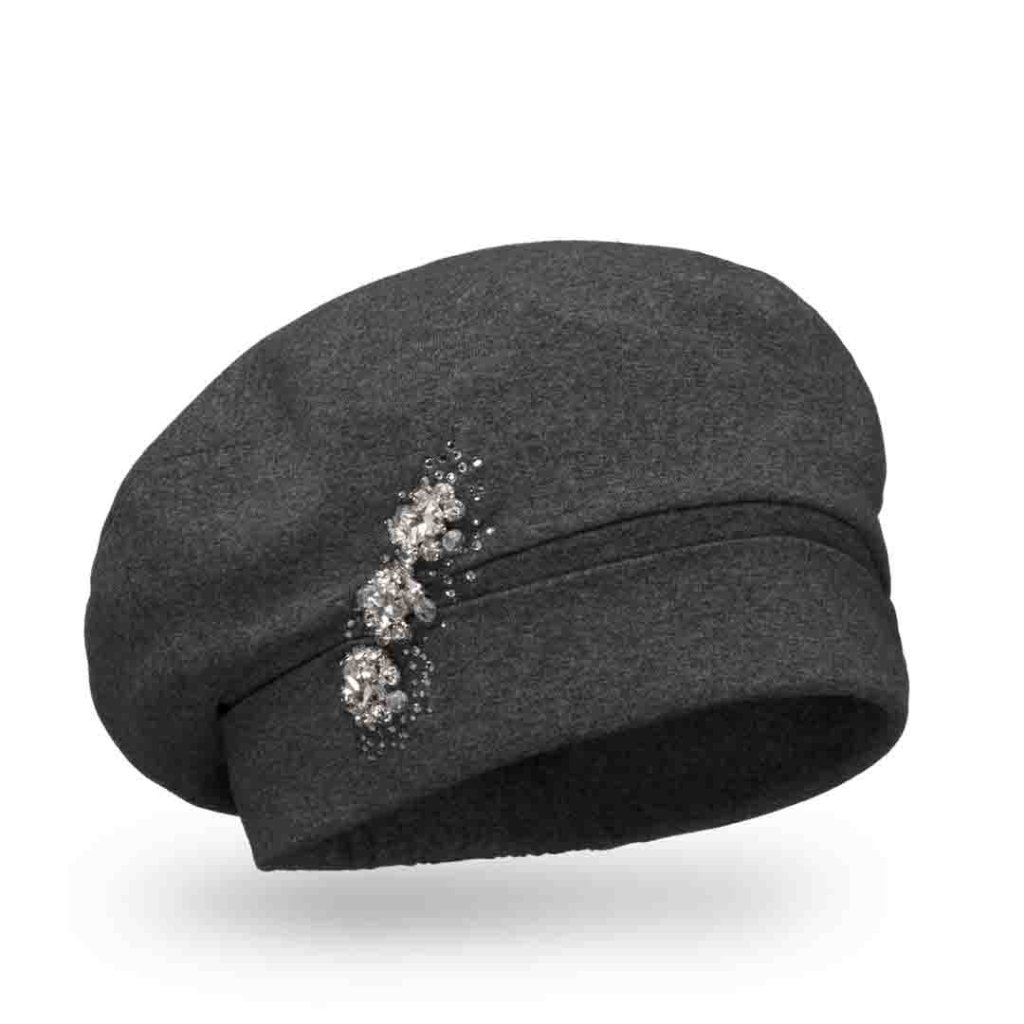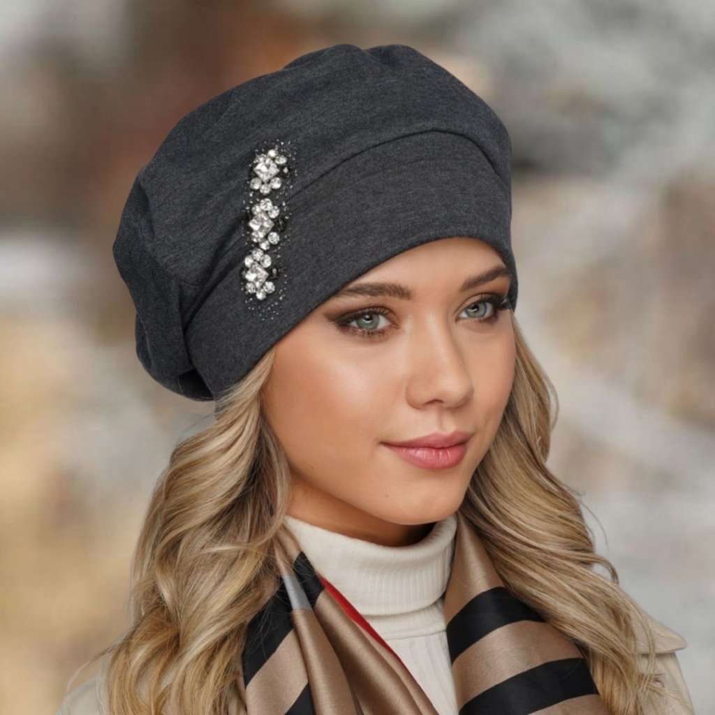 Dámská tmavě šedá čepice je precizně řemeslně zpracovaná na dotek z velmi příjemného a jemného materiálu je ozdobena luxusní ozdobou z bílých zirkonů, kterou lemují kamínky sladěné s barvou čepice tón v tónu. Pohodlná dámská čepice má baretový střih, díky kterému neutrpí váš účes a zaručuje vždy perfektní vzhled, který hlavu neobepíná. Čepice je ušitá ze dvou vrstev bavlněné tkaniny má moderním a velmi slušivý baretový střih s pružným lemem. Tuto celoroční čepici doladíte i k ležérnímu stylu oblečení. Čepici nabízíme v několika barevných provedení a také v materiálu z viskózy (umělé hedvábí).