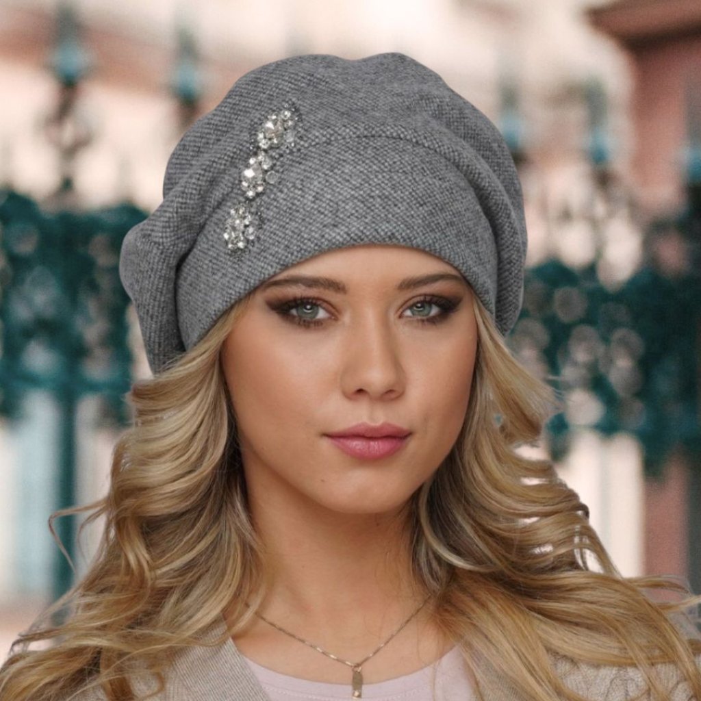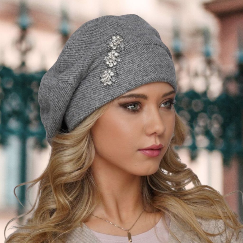 Dámská šedá čepice je precizně řemeslně zpracovaná na dotek z velmi příjemného a jemného materiálu je ozdobena luxusní ozdobou z bílých zirkonů, kterou lemují kamínky sladěné s barvou čepice tón v tónu. Pohodlná dámská čepice má baretový střih, díky kterému neutrpí váš účes a zaručuje vždy perfektní vzhled, který hlavu neobepíná. Čepice je ušitá ze dvou vrstev tkaniny má moderním a velmi slušivý baretový střih s pružným lemem. Tuto celoroční čepici doladíte i k ležérnímu stylu oblečení. Čepici nabízíme v několika barevných provedení a také v materiálu z bavlny.