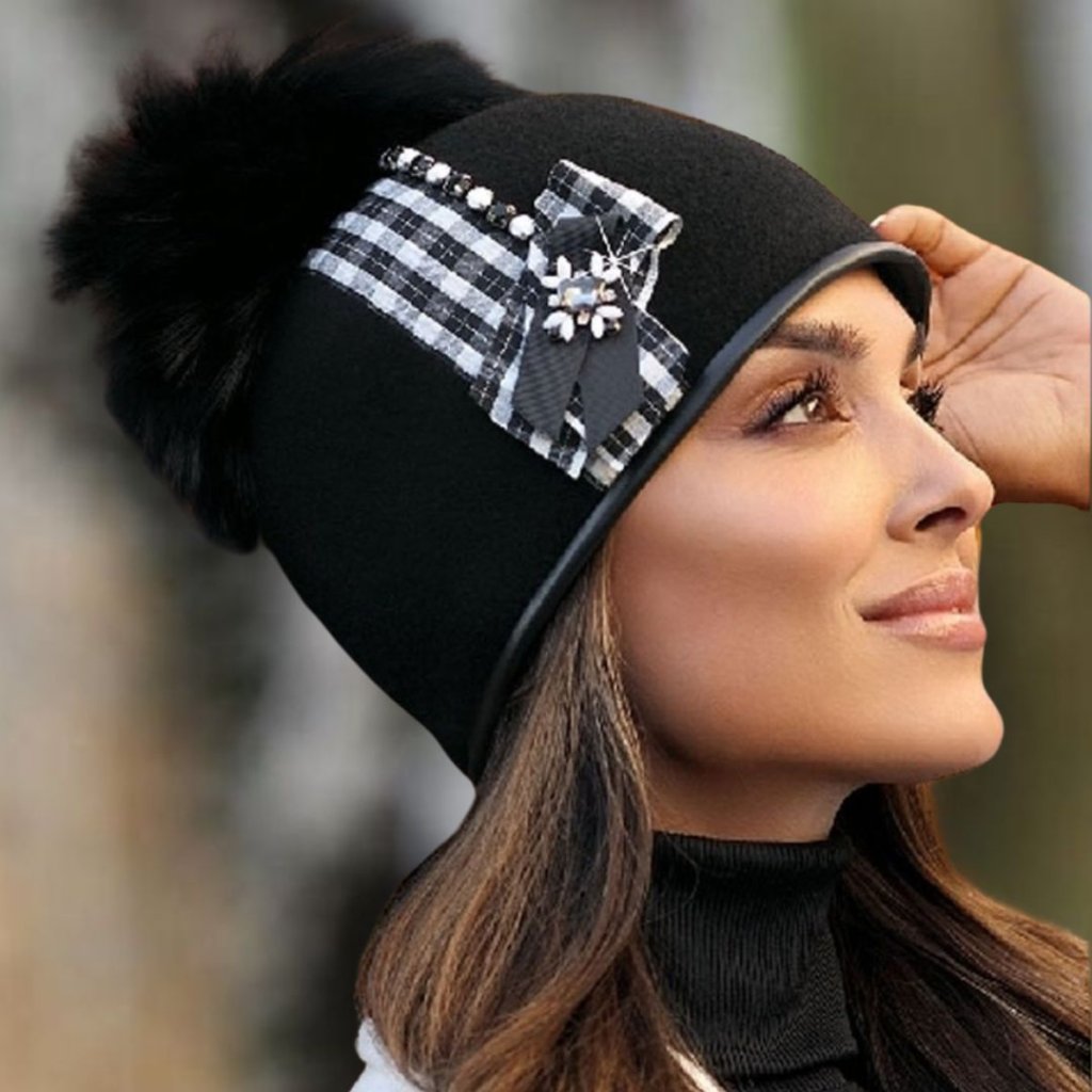 Jedinečná zimní černá čepice s bambulí vyrobená z nejkvalitnější české vlny s certifikátem Woolmark quality, která se dokonale přizpůsobí každé velikosti hlavy. Černá čepice má originální charakter, který jí dodává aplikace tvořená stuhou a ozdobnými kamínky. Celek čepice je doplněn přírodní kožešinovou bambulí obarvenou do tónu barvy vlny. V lemu čepice je šňůrka pro pohodlnou regulaci velikosti.