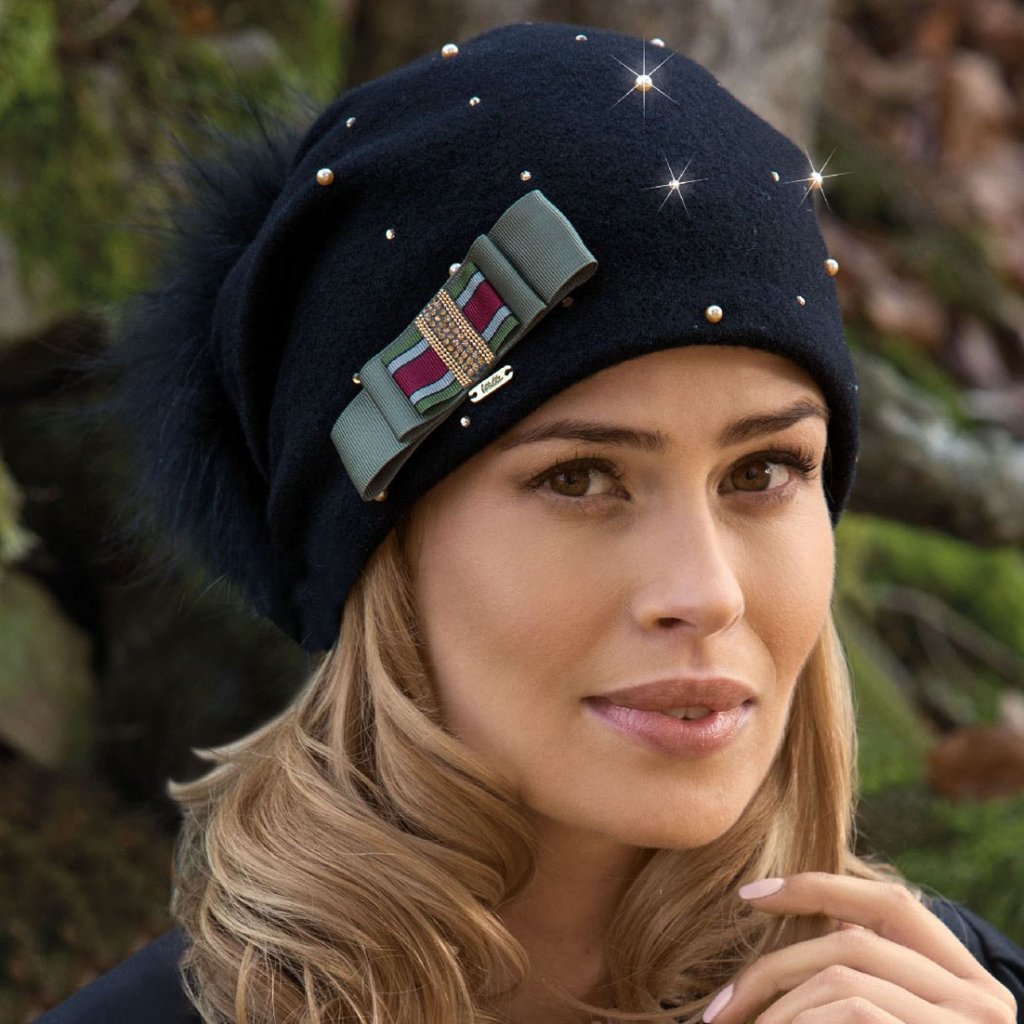 Černá zimní čepice s velkou přírodní bambulí má moderní spadlý střih, který je velice slušivý. Povrch čepice je zdoben aplikací kamínků a perliček, které jí dodávají jedinečný charakter. Originální mašle je výsledkem ruční práce. Díky měkké vlně se výrobek přizpůsobí každé velikosti hlavy. Čepice má uvnitř hřejivou a měkkou flísovou podšívku. Tuto krásnou čepici nabízíme také ve vínové a khaki barvě.
