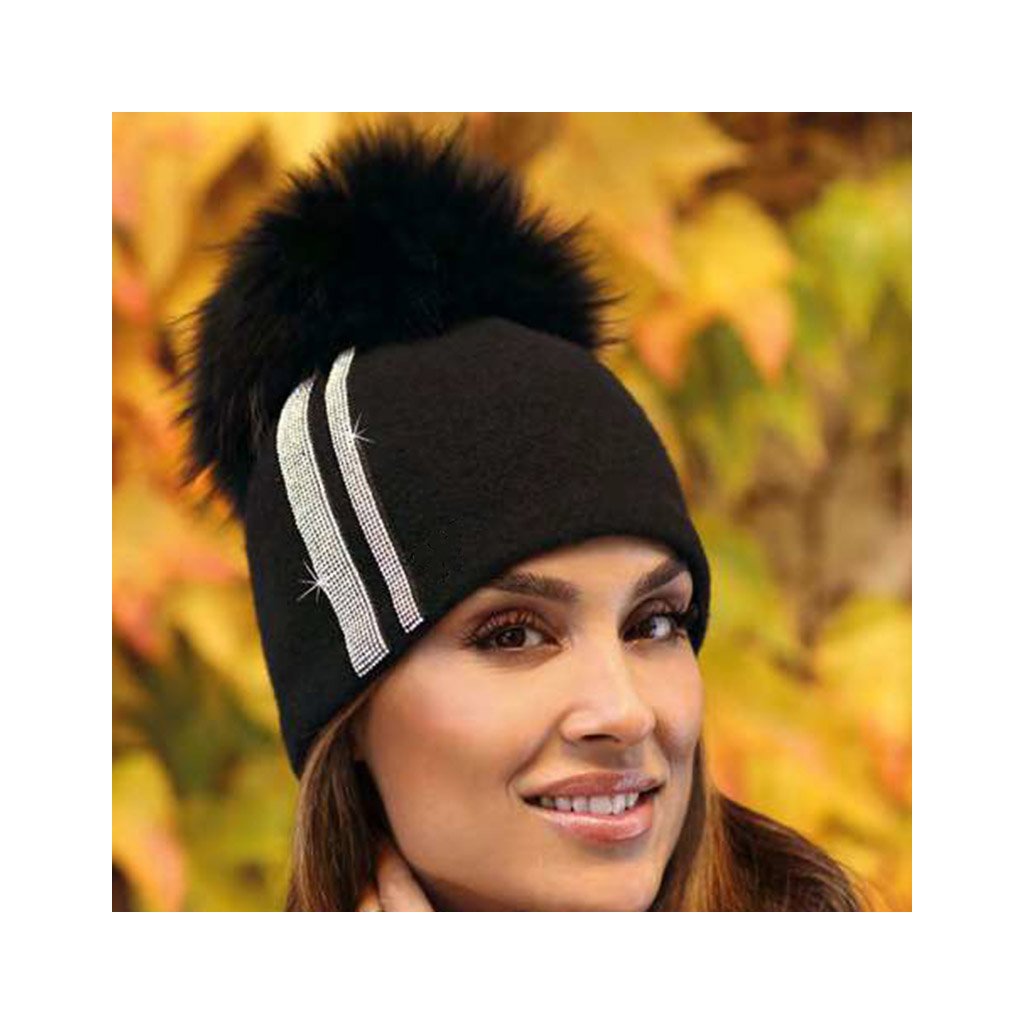 Módní a nápaditá čepice vyrobená z certifikované 100% české vlny Woolmark quality. Vertikálně běžící pásky z krystalů jí dodávají elegantní charakter. Celek čepice doplňuje přírodní kožešinová černá bambulka. Díky měkké vlně se výrobek přizpůsobí každé velikosti hlavy. Čepice má teplou a měkkou flísovou podšívku.