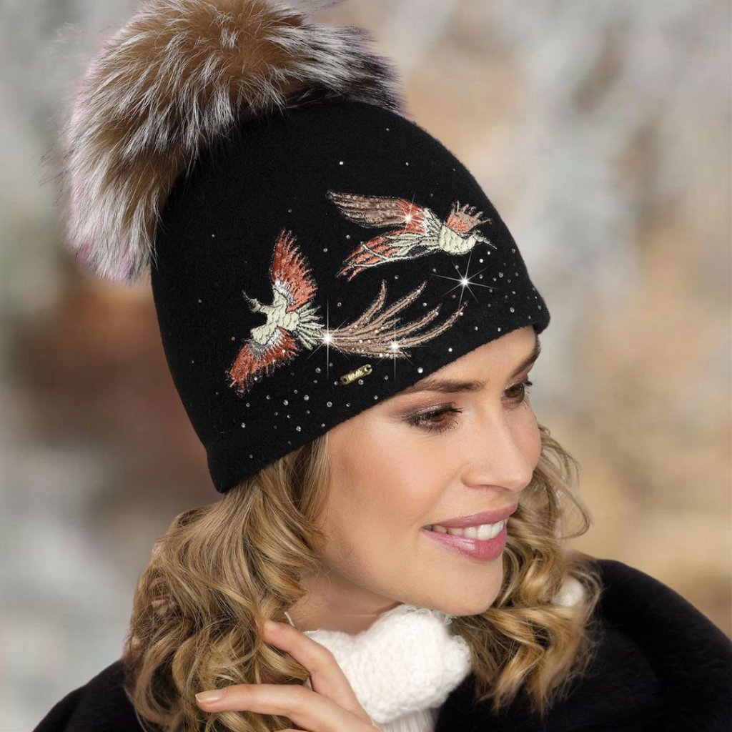 Černá zimní čepice s bambulí z nejkvalitnější 100% vlny s certifikátem Woolmark, která se dokonale přizpůsobí každé velikosti hlavy. Povrch čepice je ručně zdobený krásnou výšivkou ptáčků a krystalů, které jí dodávají jedinečný charakter. Celek čepice s bambulí je doplněn přírodní kožešinovou bambulí obarvenou do tónu barvy výšivky. Čepice má teplou měkkou podšívku.
