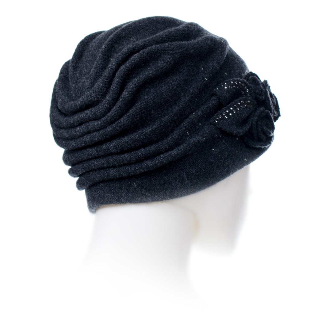 Dámská elegantní zimní čepice s originálními ručně vytvořenými květy a třpytivými kamínky. Šedá vlněná čepice má krásný propracovaný střih, který je vzadu stažený do sámků. Čepice má krásný tvar a skvěle sedí.