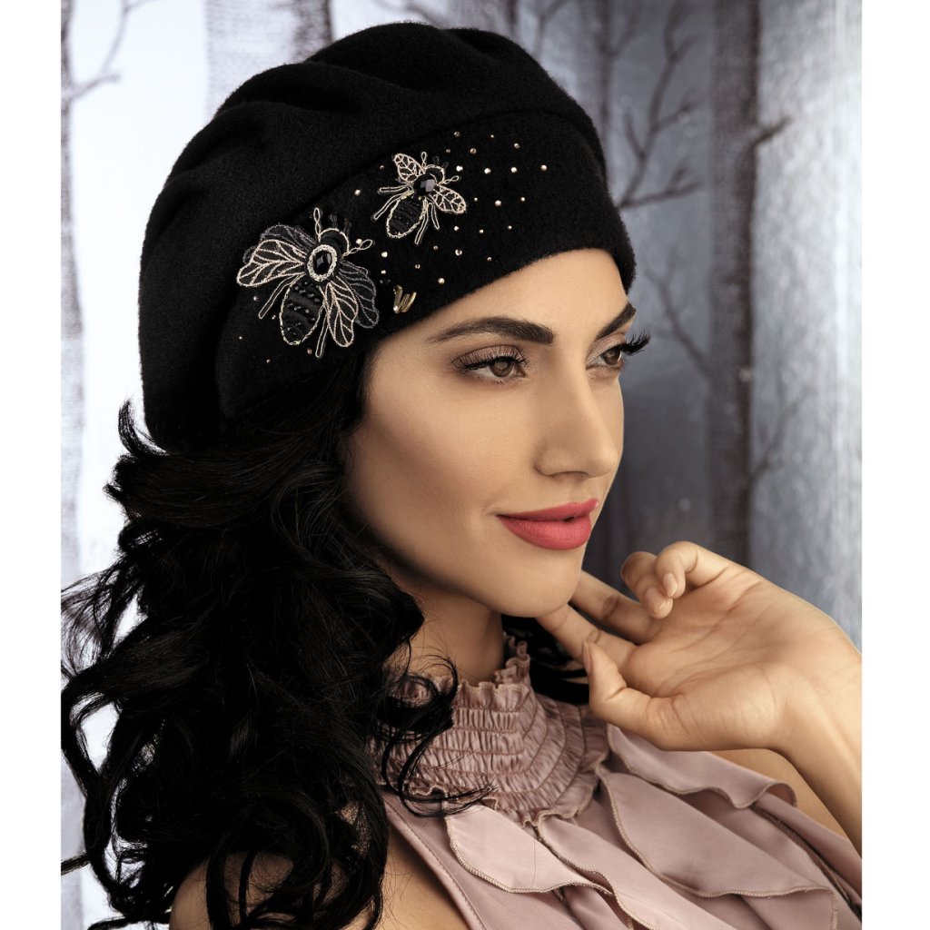 Elegantní zimní čepice nejkvalitnější vlny s certifikátem Woolmark, která se dokonale přizpůsobí každé velikosti hlavy. Starorůžový baret s lemem má originální charakter, který mu dodává lehce třpytivá aplikace tvořená včelkami a třpytivými krystaly. Zimní čepice má slušivý a pohodlný střih, který nemačká účes.