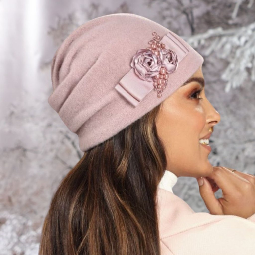 Růžová zimní čepice ze 100% české vlny se značku Woolmark Quality s dokonale ladící ozdobou v moderním spadlém střihu, který je velmi slušivý a pohodlný. Je zdobená saténovými růžemi stejné barvy. Růže jsou výsledkem ruční práce. Okvětní lístky se ručně opalují a spojují tak, aby vytvořily poupata růží. Vše je zdobeno krystaly a perlami tón v tónu. Díky kvalitním materiálům tento kousek perfektně doplní nejen váš kabátek, ale zahřeje vás i na horách a skvěle doladí váš volnočasový outfit.