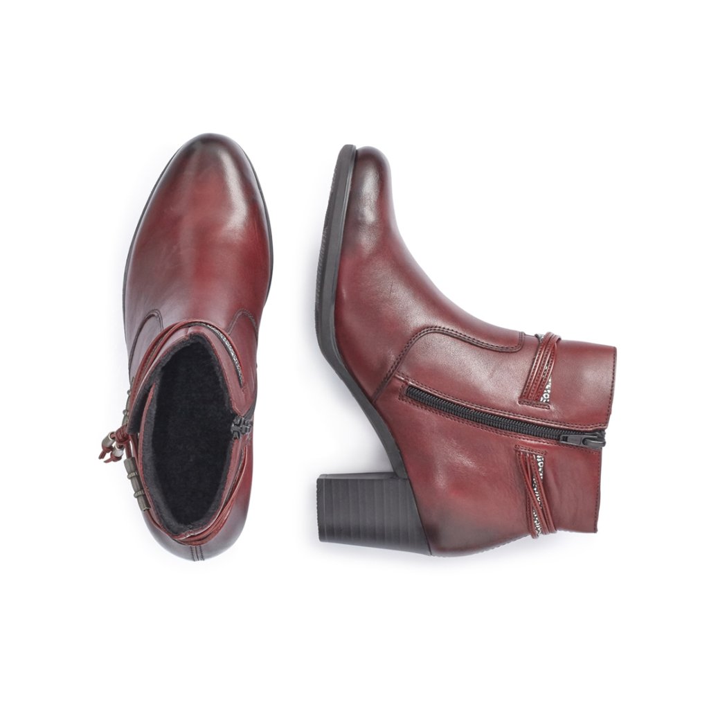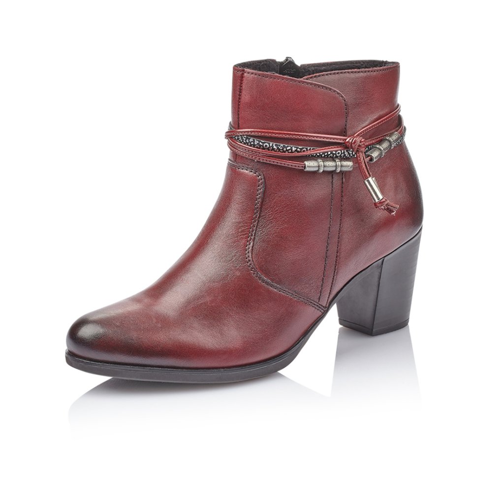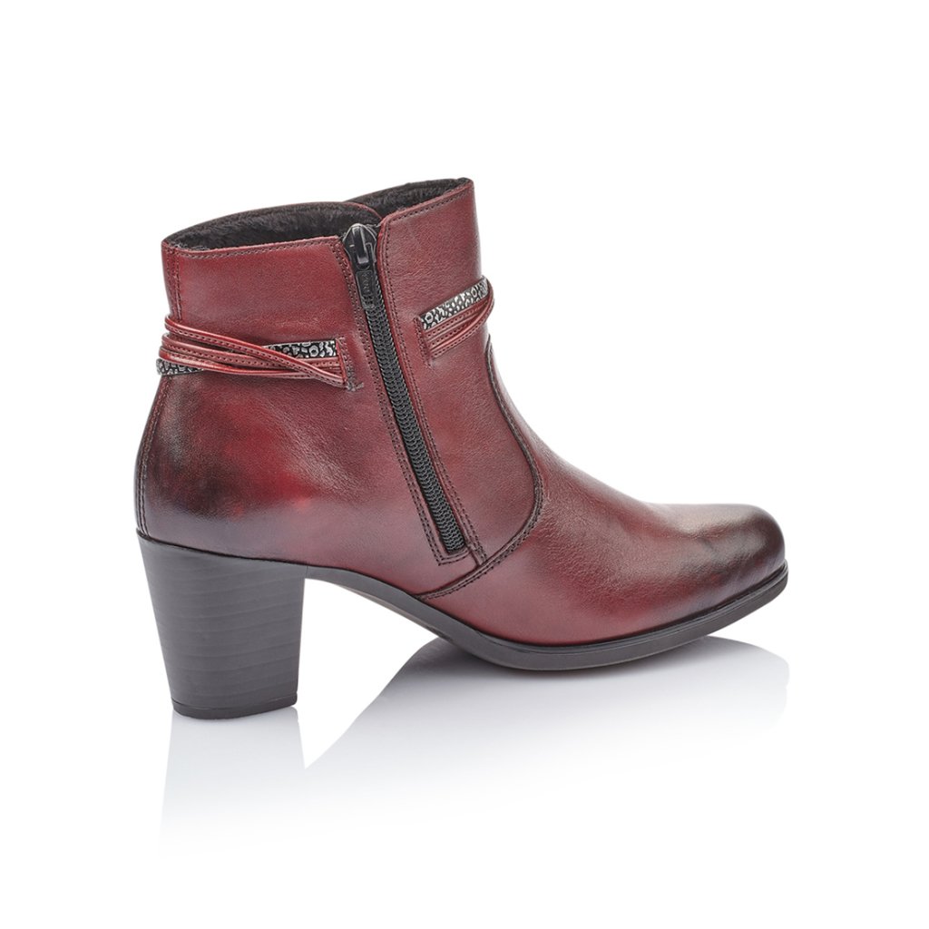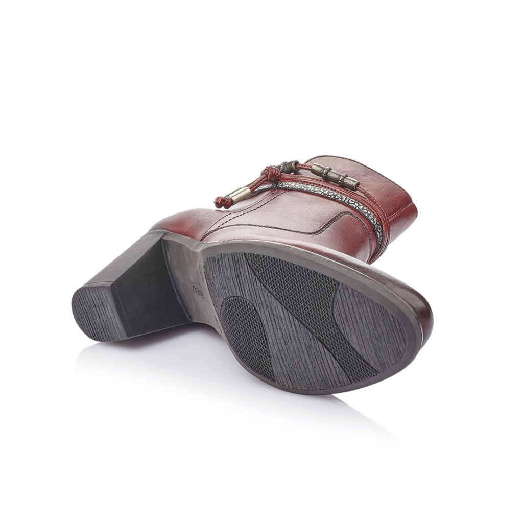 Dámská kotníčková obuv RIEKER z patinované kůže ve vínové barvě zdobená jemnými pásečky kolem kotníku. Zapínání obuvi je na zip na vnitřní straně. Je vyteplená fleesovou podšívkou a vlepenou zateplenou stélkou. Obuv Rieker je vyrobena speciální technologií Antistress poskytující lehkost a ohebnost obuvi, dostatečný vnitřní prostor a absorbci nárazů a otřesů na páteř při chůzi. Výška obuvi od podpatku je cca 11 cm.