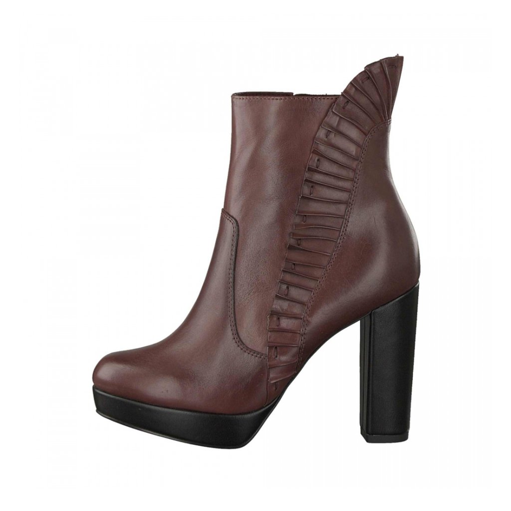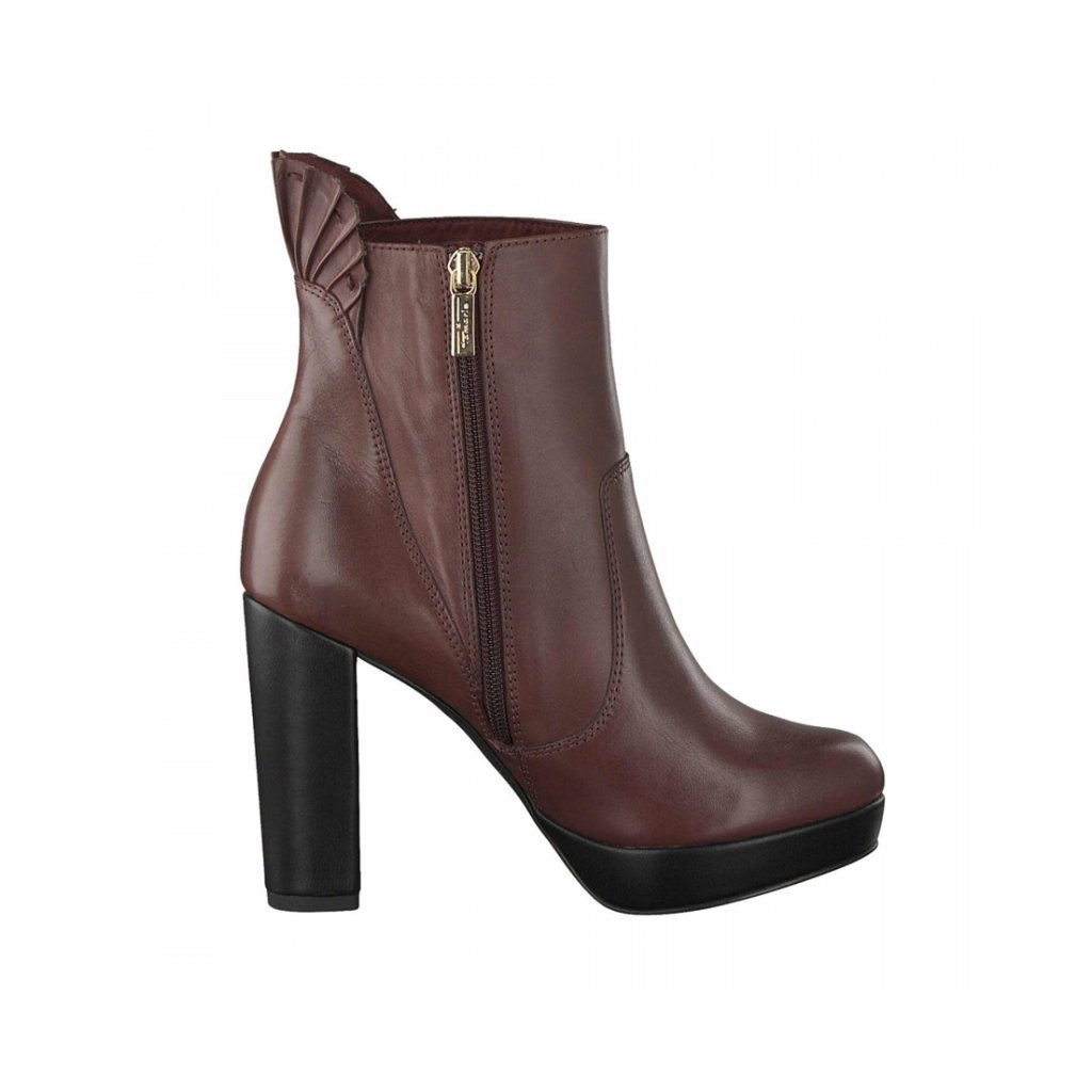Dámské kotníkové boty vínové barvy na vysokém podpatku, které bude milovat každá žena. Svršek je vyroben z kůže a zajistí příjemný pocit při nošení po celý den. Vnitřek boty tvoří stélka Touch-It, která se dokonale přizpůsobí tvaru Vaší nohy. Hlavním a nepřehlédnutelným rysem této boty je cca 9,5 cm vysoký podpatek. Svršek boty je na boku doplněn o praktické zipové zapínání.