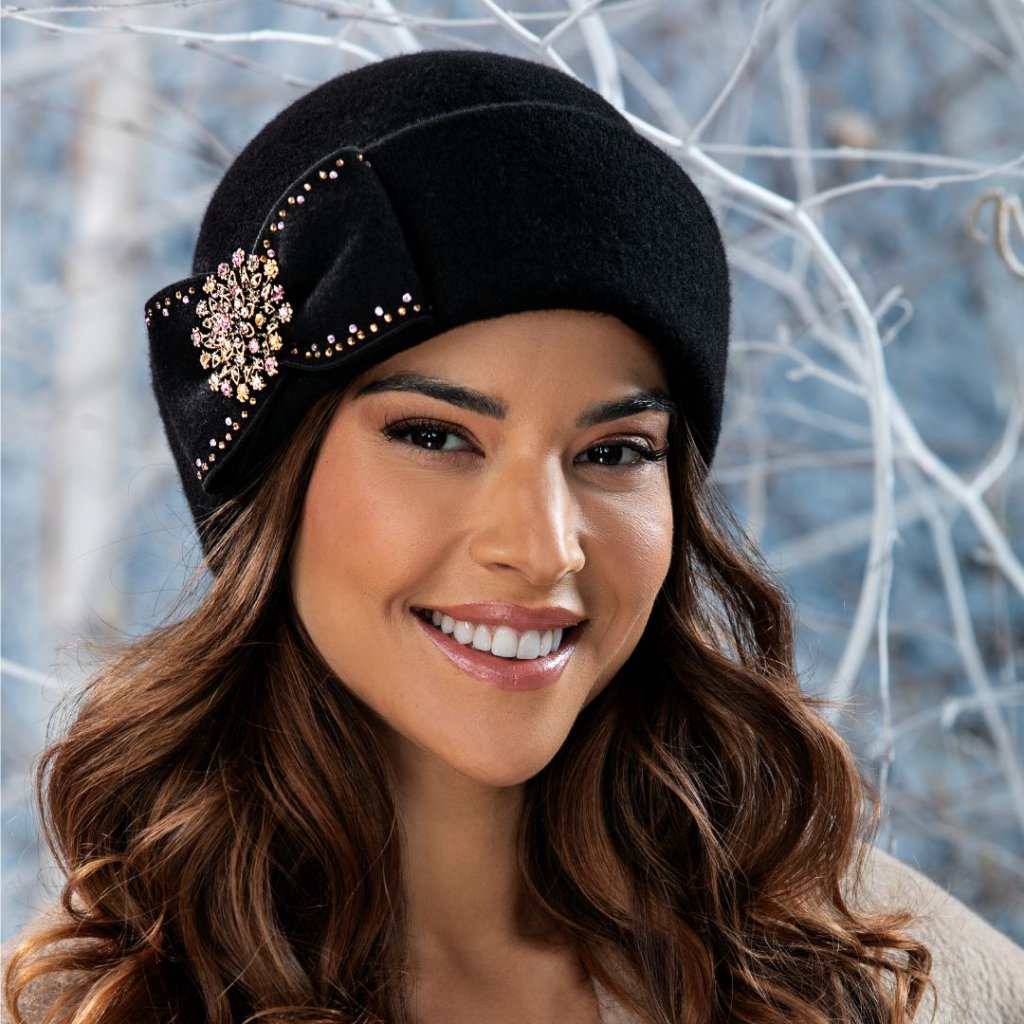 Výrazným prvkem je tónovaná mašle zdobená jemnými kamínky a broží, která čepici dodává jemný ženský a stylový nádech.