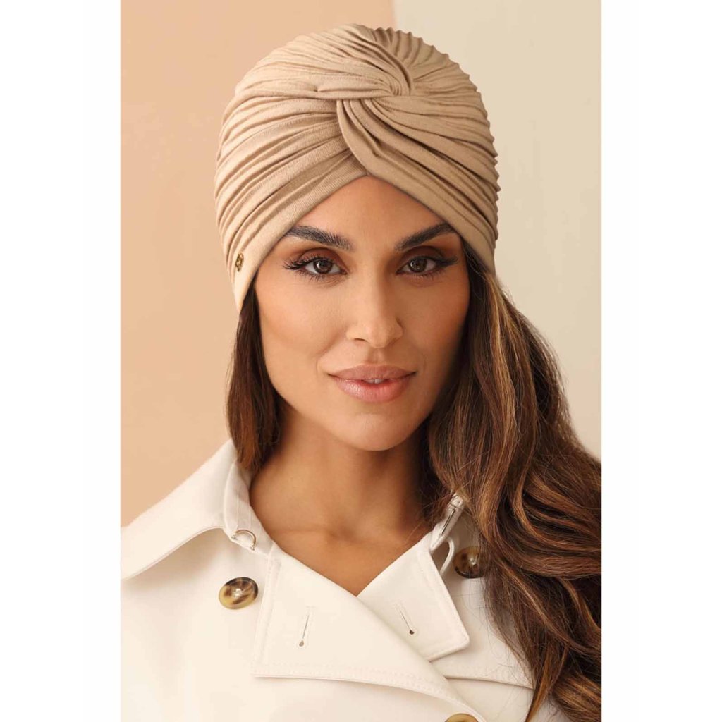 Béžová bavlněná čepice Turban je precizně ručně ušitá z kvalitní bavlny s vysokou hustotou tkaní ze dvou vrstev tkaniny a má úžasný slušivý střih, který je řasený do turbanu. Bavlna je velice příjemná na dotek, nesvírá hlavu. Dámský turban oceníte především v jarním a podzimním období.