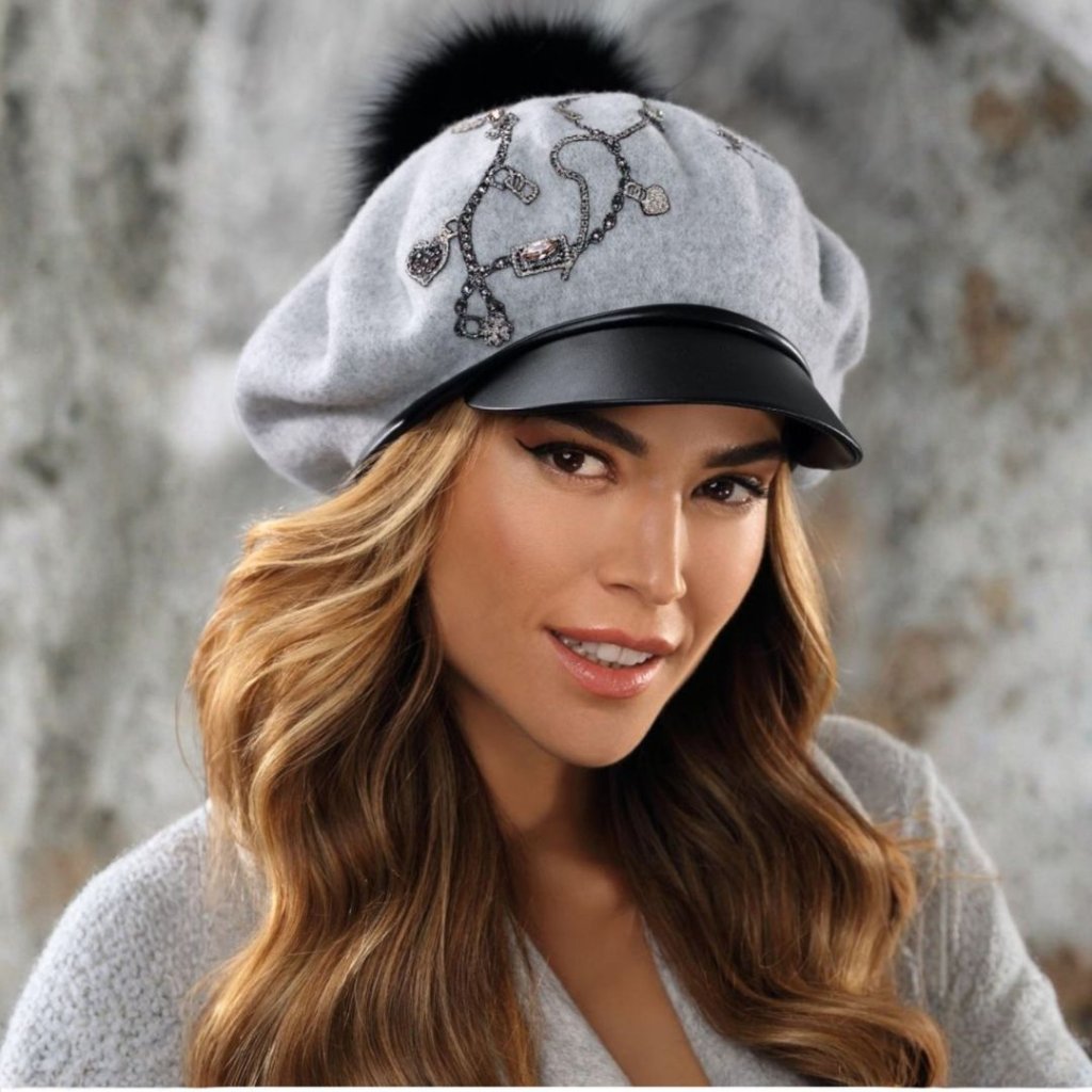 Elegantní světle šedá dámská kšiltovka vyrobená z hřejivé a měkké certifikované vlny Woolmark melange, která se dokonale přizpůsobí každé velikosti hlavy. Jedinečný charakter dodává zimní čepici extrémně ženská aplikace tvořená třpytivými stříbřitými řetízkovými výšivkami a třpytivými ručně přišitými zirkony. Celek doplňuje přírodní kožešinová bambulka v černé barvě. Zimní čepice s kšiltem má nastavitelné šňůrky pro úpravu velikosti.