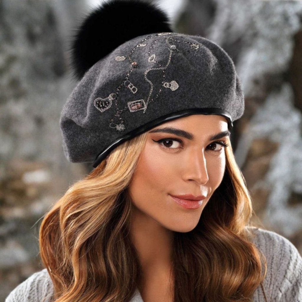 Elegantní tmavě šedý zimní baret z hřejivé a měkké certifikované vlny Woolmark, která se dokonale přizpůsobí každé velikosti hlavy. Jedinečný charakter šedému baretu dodává extrémně ženská aplikace tvořená třpytivými stříbřitými řetízkovými výšivkami a třpytivými ručně přišitými zirkony. Celek čepice doplňuje přírodní kožešinová bambulka.