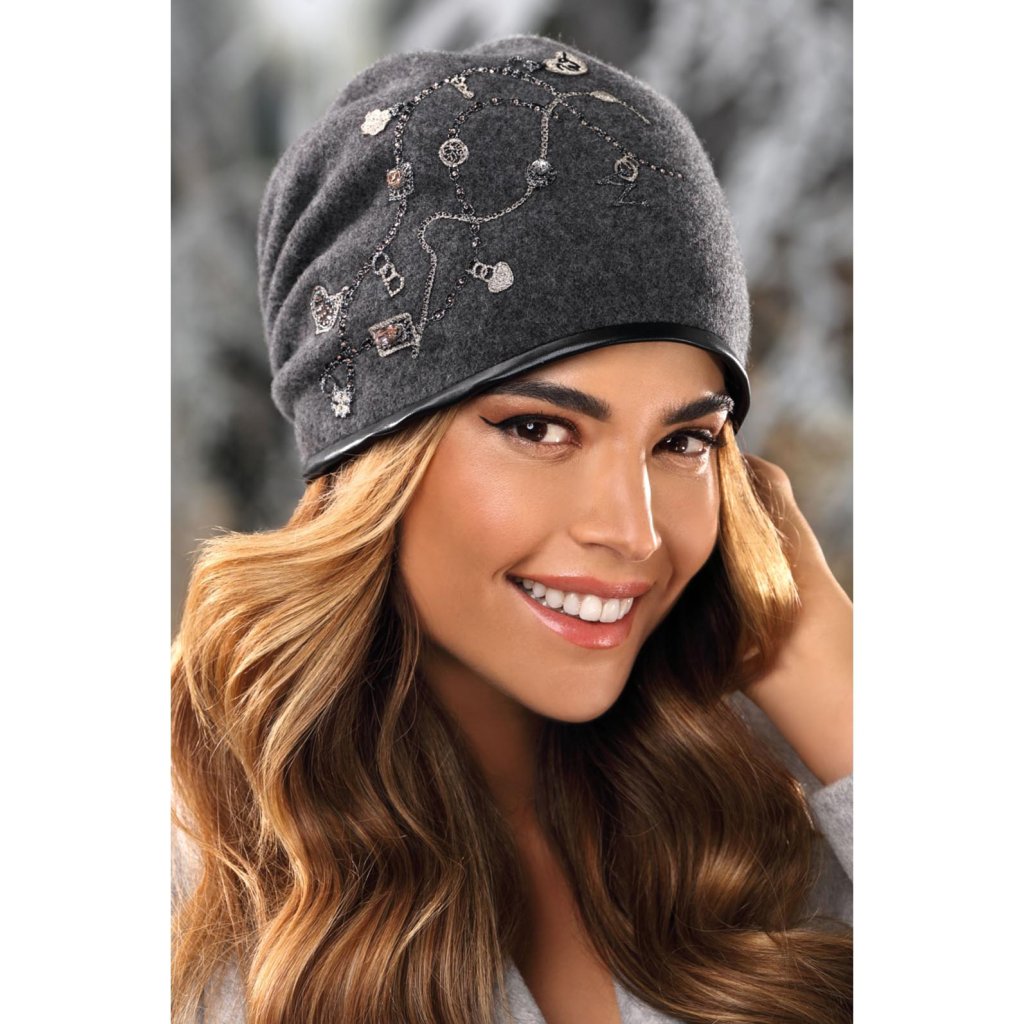 Dámská vlněná čepice s výšivkou bižuterie W-0613/844 antracitový melange