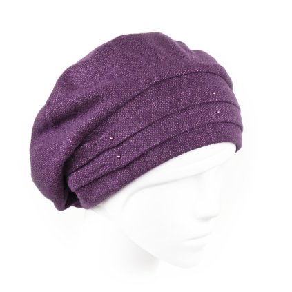 Fialová zimní čepice ze 100% české vlny se značku Woolmark Quality je ušitá v moderním spadlém střihu, který je velmi slušivý a pohodlný. Je ručně ozdobená prošívanými sámky a kamínky. Díky kvalitním materiálům tento kousek perfektně doplní nejen váš kabátek, ale zahřeje vás i na horách a skvěle doladí váš volnočasový outfit.