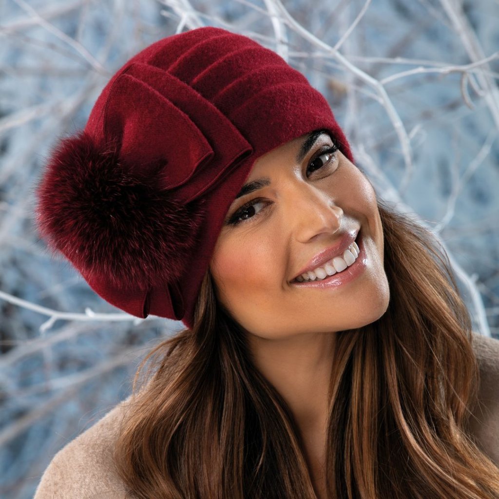 Dámská vlněná zimní čepice s kožešinou od Krumlovanky 100% vlna- vínová W-0007/144