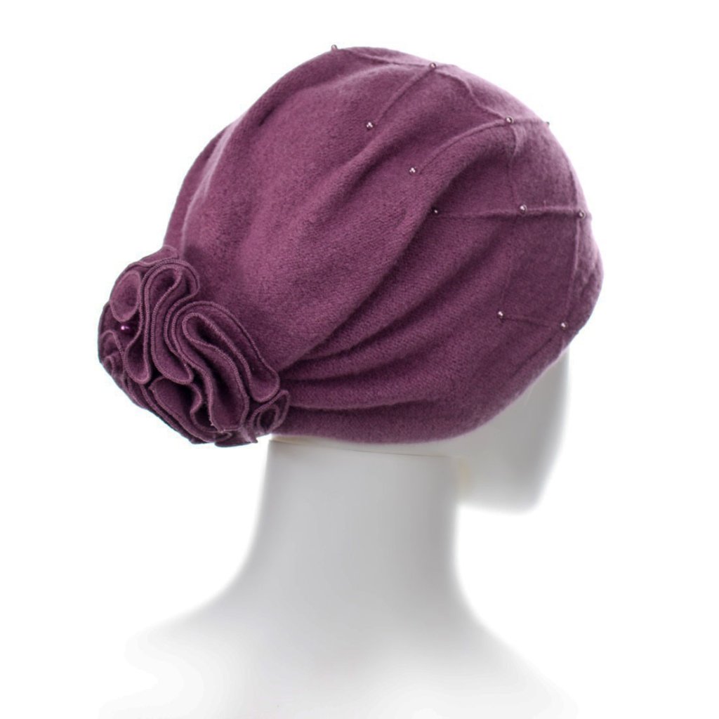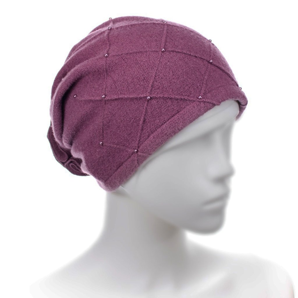 Dámská zimní vlněná čepice v tmavě růžové barvě má velice slušivý spadlý střih stažený na temeni hlavy do květu. Je ručně ozdobená krásnou aplikací s perličkami tón v tónu. Naše nabídka dámských zimních čepic je zaměřena na ženy, které oceňují kombinaci klasické elegance a nejnovějších trendů módy. U vlněných čepic se značkou Woolmark Quality najdete vysokou kvalitu, originalitu a především funkčnost. Velký důraz je kladený na precizní ruční výrobu a luxusní bižuterii.