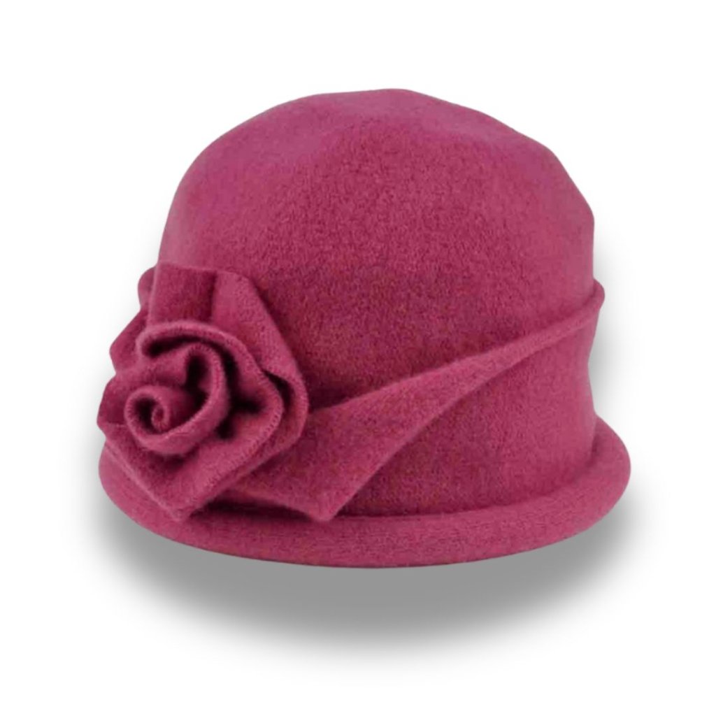 Růžově lila zimní čepice z nejkvalitnější vlny s certifikátem Woolmark, která se dokonale přizpůsobí každé velikosti hlavy. Vlněná čepice skvěle sedí a je precizně propracovaná, zdobená ručně květem růže. Zimní klobouk má kulatý polstrovaný lem a drží skvěle tvar.