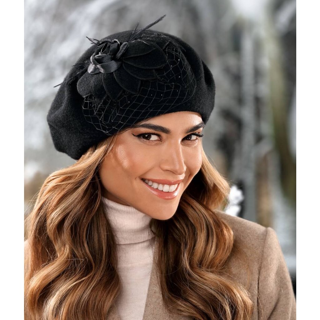 Dámská zimní čepice - baret s květem a síťkou W-0628/018 černý