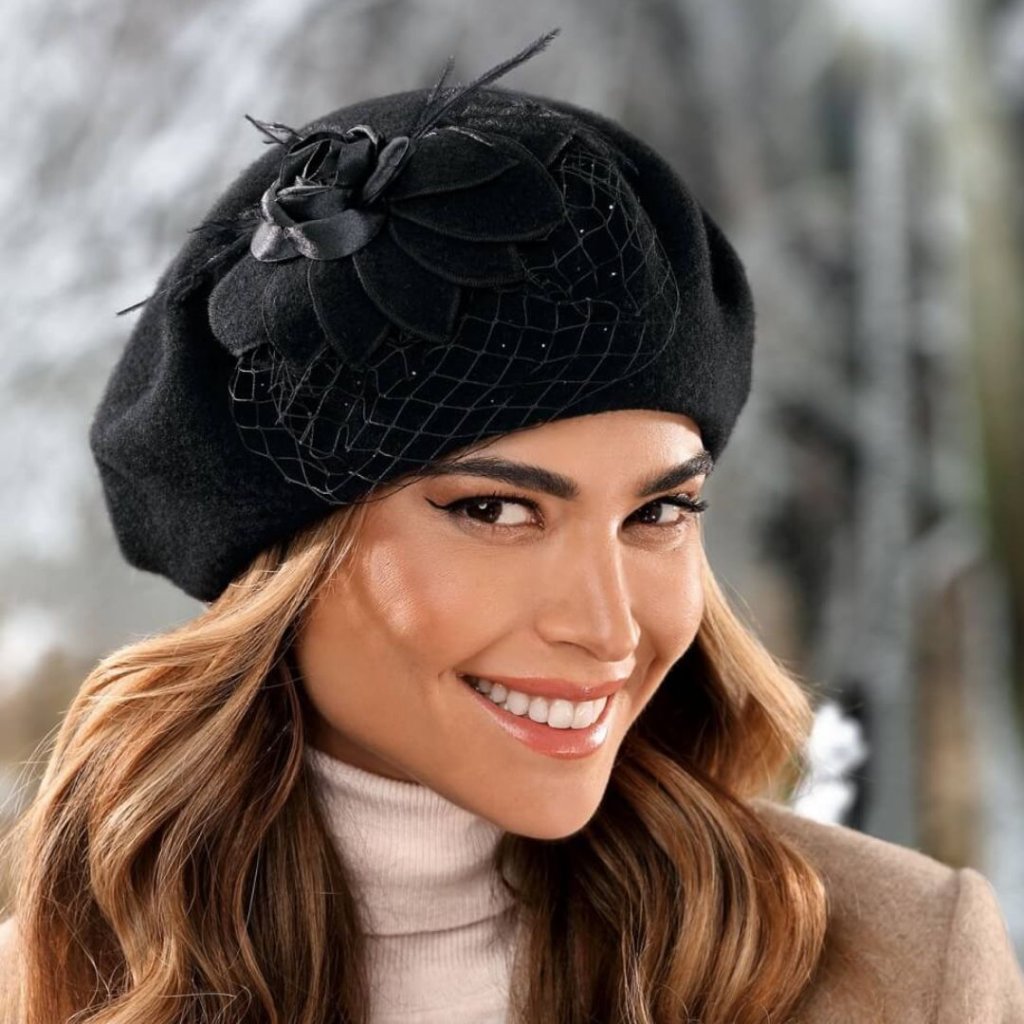 Elegantní černý baret z nejkvalitnější vlny s certifikátem Woolmark, která se dokonale přizpůsobí každé velikosti hlavy je zdobený ručně. Elegantní charakter a půvab dodává černé čepici mimořádně efektní ozdoba ze saténového květu, černého pštrosího peří, závoje a třpytivých krystalů.