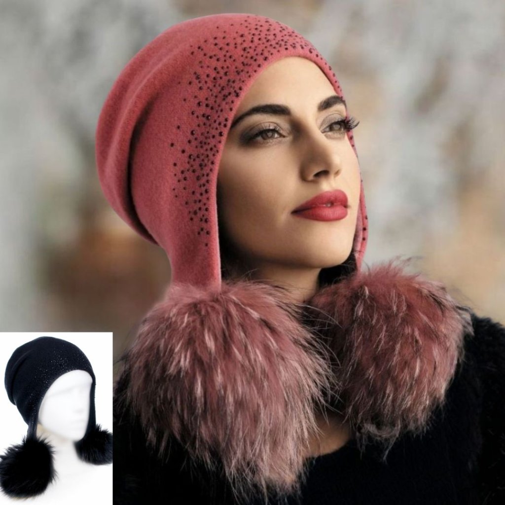 Dámská zimní vlněná černá čepice spadlého střihu je ozdobená kamínky a kožešinovými bambulemi tónu v tónu. Skvělý střih čepice, který dobře sedí a spodní dvě bambule krásně ukončí Vaší kapuci nebo kabátek. Čepice má flísovou podšívku.