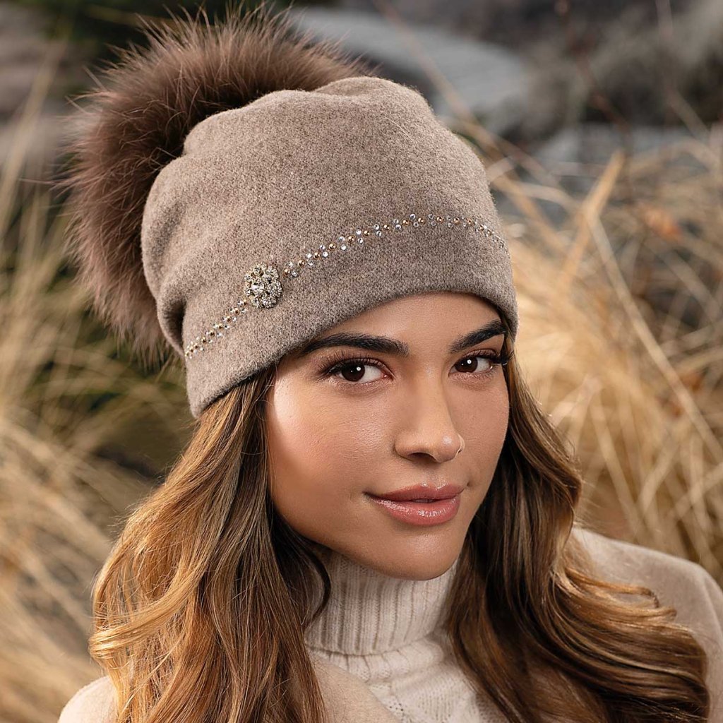 Dámská zimní čepice s bambulí 100% Woolmark W-832/690 tmavě béžový melange
