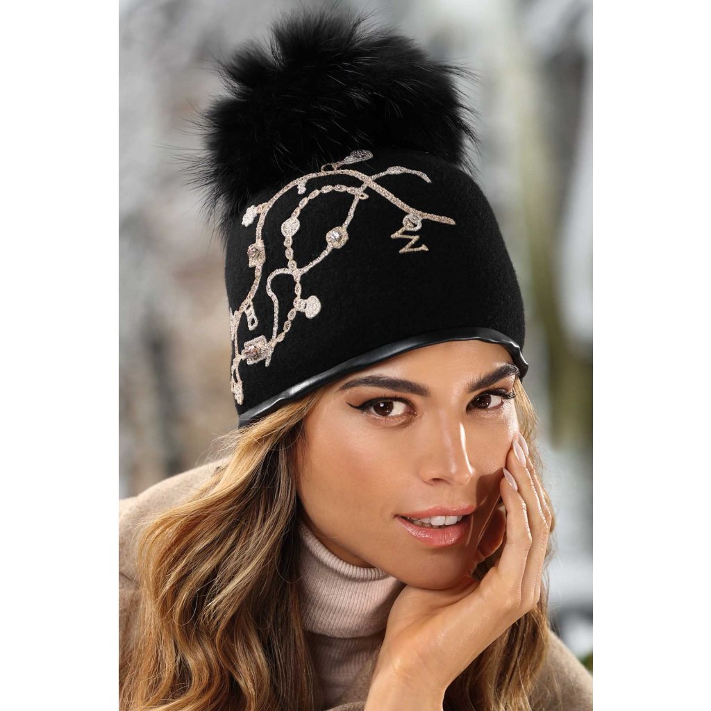 Elegantní černá zimní čepice z hřejivé a měkké certifikované vlny Woolmark, která se dokonale přizpůsobí každé velikosti hlavy. Jedinečný charakter dámské zimní čepice dodává extrémně ženská aplikace tvořená zlatě třpytivou řetízkovou výšivkou a třpytivými ručně přišitými zirkony. Celek doplňuje přírodní kožešinová bambulka. Černá vlněná čepice má teplou a měkkou podšívku a nastavitelné šňůrky pro snadnou úpravu velikosti.