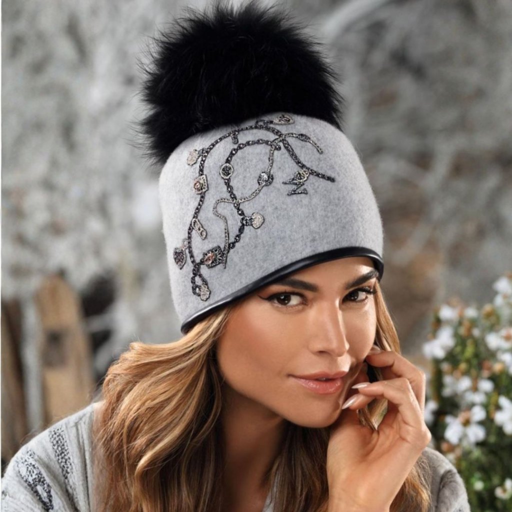 Elegantní šedá zimní čepice z hřejivé a měkké certifikované vlny Woolmark, která se dokonale přizpůsobí každé velikosti hlavy. Jedinečný charakter dámské zimní čepice dodává extrémně ženská aplikace tvořená zlatě třpytivou řetízkovou výšivkou a třpytivými ručně přišitými zirkony. Celek doplňuje přírodní kožešinová bambulka. Šedá vlněná čepice má teplou a měkkou podšívku a nastavitelné šňůrky pro snadnou úpravu velikosti.