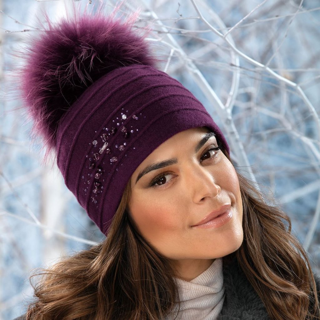 Dopřejte si zimní eleganci s touto luxusní fialovou čepicí z 100% vlny s certifikací Woolmark. Čepice je navržena pro ženy, které ocení nejen teplo, ale i styl. Kožešinová bambule, dodává čepici nádech noblesy, zatímco jemné ručně vyšívané skleněné kamínky tón v tónu z ní dělají skutečný klenot mezi zimními doplňky.
